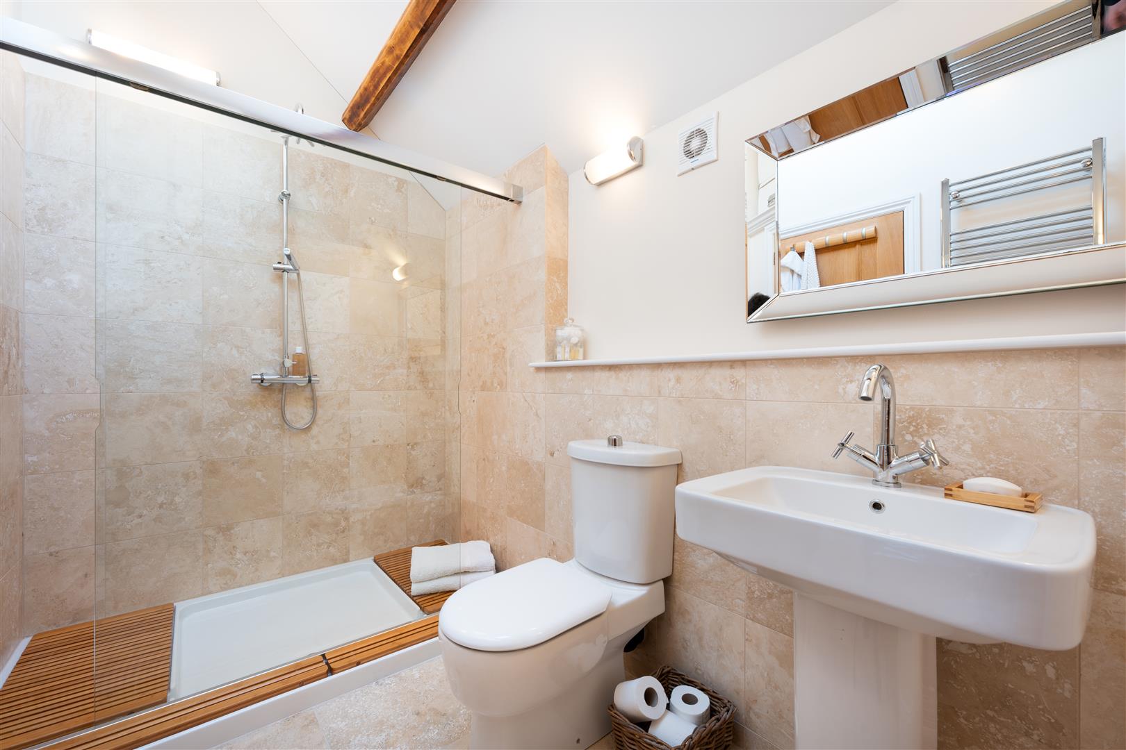 En-Suite - 2.86m x 1.66m (9'4" x 5'5") - Tasteful shower room with step in double shower featuring rainfall showerhead, WC and pedestal wash basin, "Travertine" tiled floor and walls, chrome ladder radiator, auto vent. Useful annex storage cupboard.