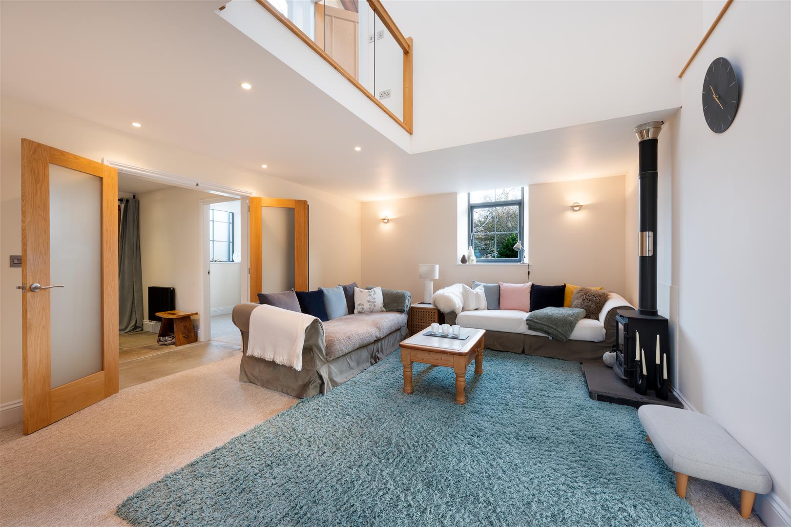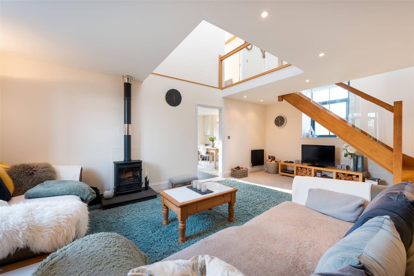 Sitting Room - 6.5m x 4.39m (21'3" x 14'4") - Glass panel double doors leading from the hall. Fitted carpet, feature tall wall radiator, second radiator, multi fuel stove on raised slate hearth, oak staircase to first floor with glass balustrades, feature high open part vaulted ceiling, wall lights, mini halogen ceiling lighting, smoke alarm, 2 double glazed windows to each side aspect.