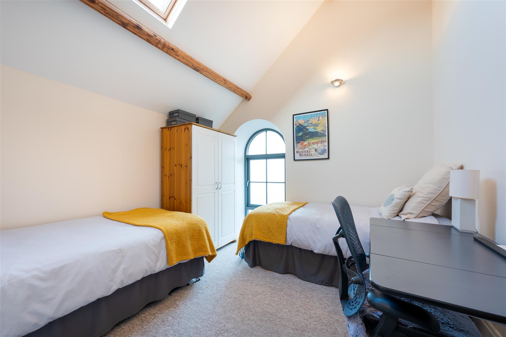 Bedroom Two - 3.52m x 3.23m (11'6" x 10'7") - Airy high vaulted ceiling feature double-glazed floor level arched window, exposed beams, VELUX with solar powered remote-controlled fitted blackout blind, radiator, fitted carpet, wall lights, TV point.