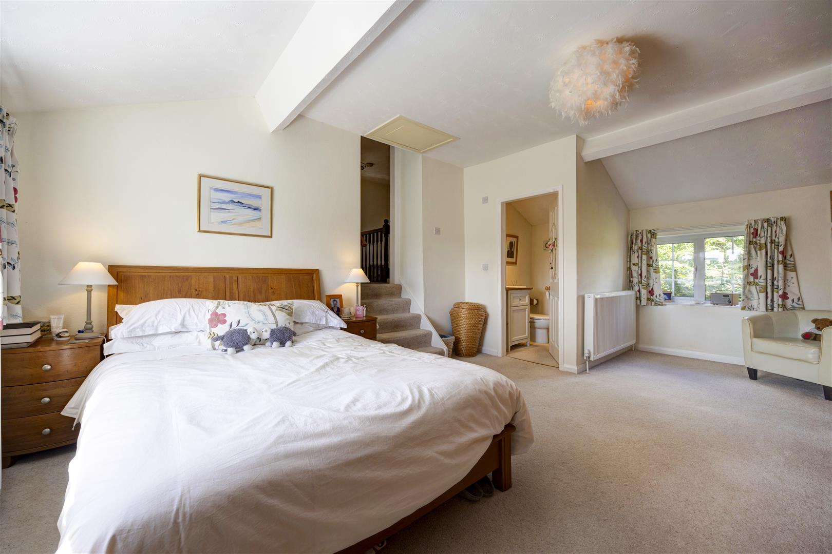 Bedroom One - 18' 0" x 12' 6" (5.49m x 3.81m) - Fitted carpet, 2 radiators, range of built in wardrobes, loft access, steps up to landing, two double glazed windows to front and rear with views over open countryside.
