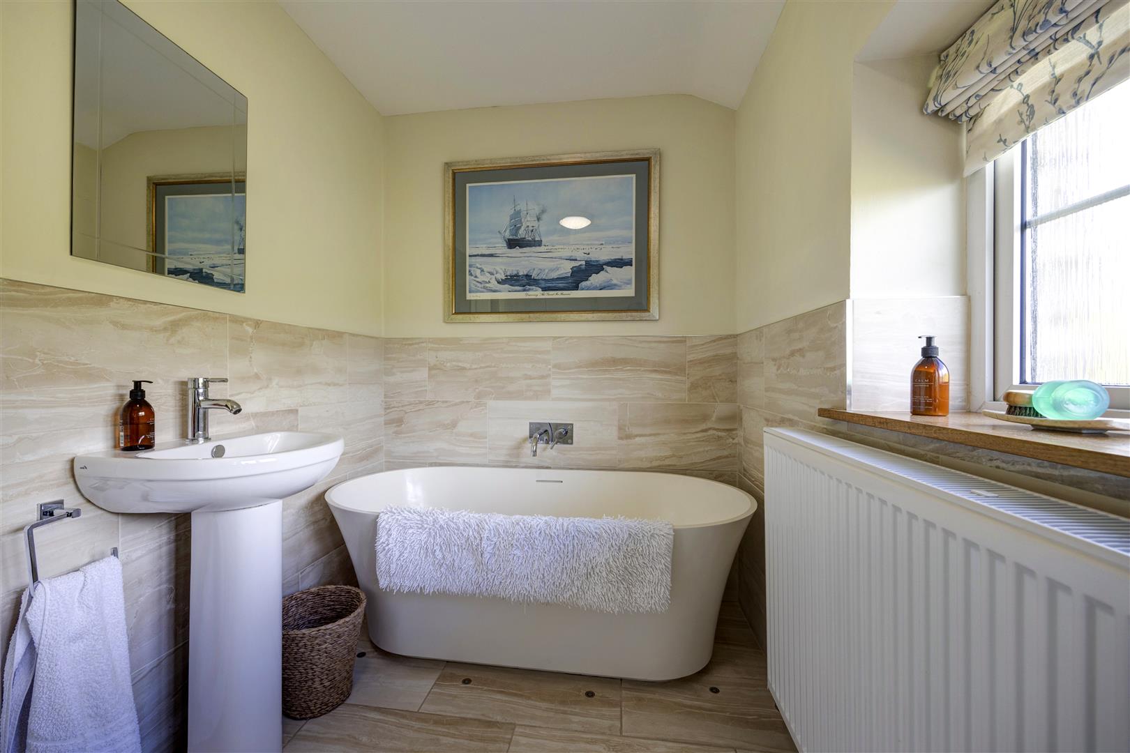 Bathroom - Ceramic tiled flooring, radiator, wash basin, toilet, shower cubicle, modern oval freestanding bath, frosted window to rear aspect.