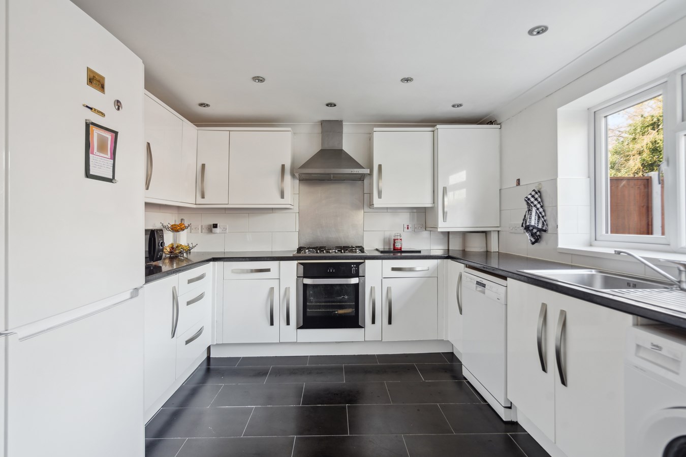 As you enter, the spacious entrance hall provides a warm welcome, complete with fitted storage for coats and shoes, as well as a convenient seating area. To the right, a generously sized living and dining room offers a versatile space for entertaining, with direct access to the rear garden. The well-appointed kitchen boasts ample fitted appliances, including a washing machine, dryer, American fridge freezer, and dishwasher. Featuring a gas hob, the kitchen also enjoys lovely views over the garden and direct access to the outdoor space.