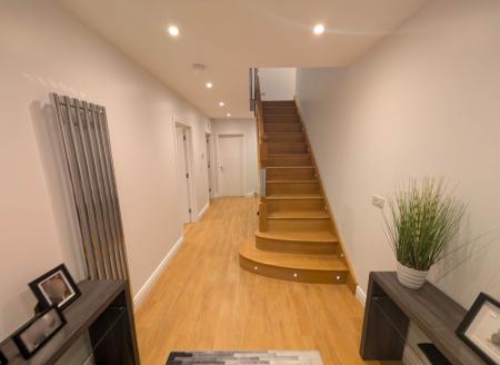 - Feature glazed and oak contemporary staircase with LED lighting leading to first and second floor