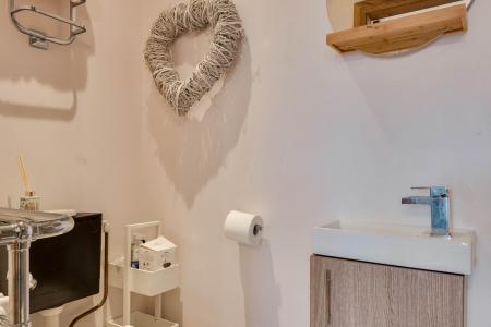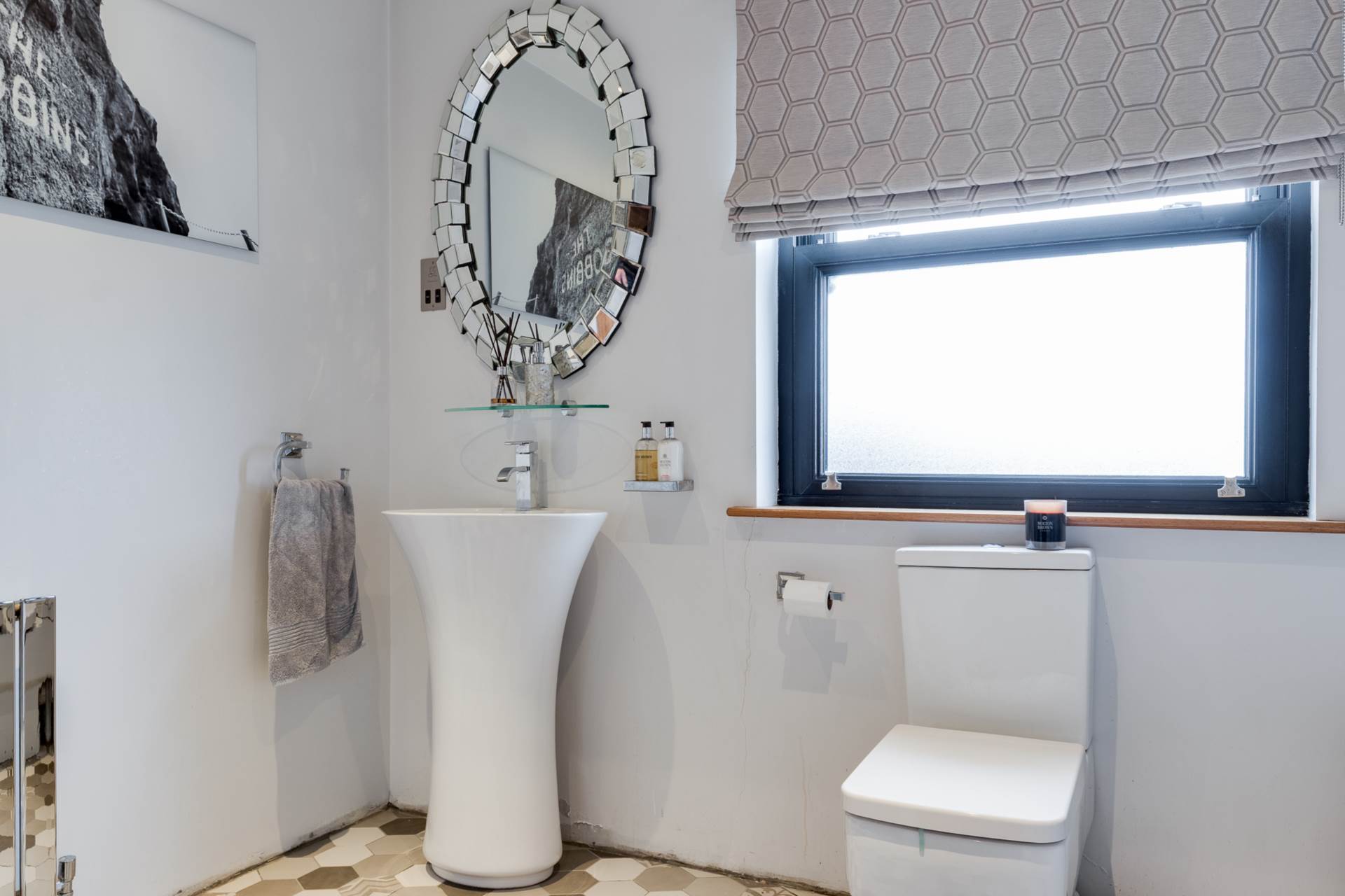 Vanity sink unit with mixer tap and low flush WC. Tiled floor.