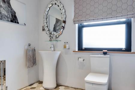 Multi jet bath with pedestal wash hand basin and mixer tap. Low flush WC. Tiled shower enclosure with chrome thermostatically controlled shower fitting. Rainfall shower head and hand held shower attachment. Tiled floor.
