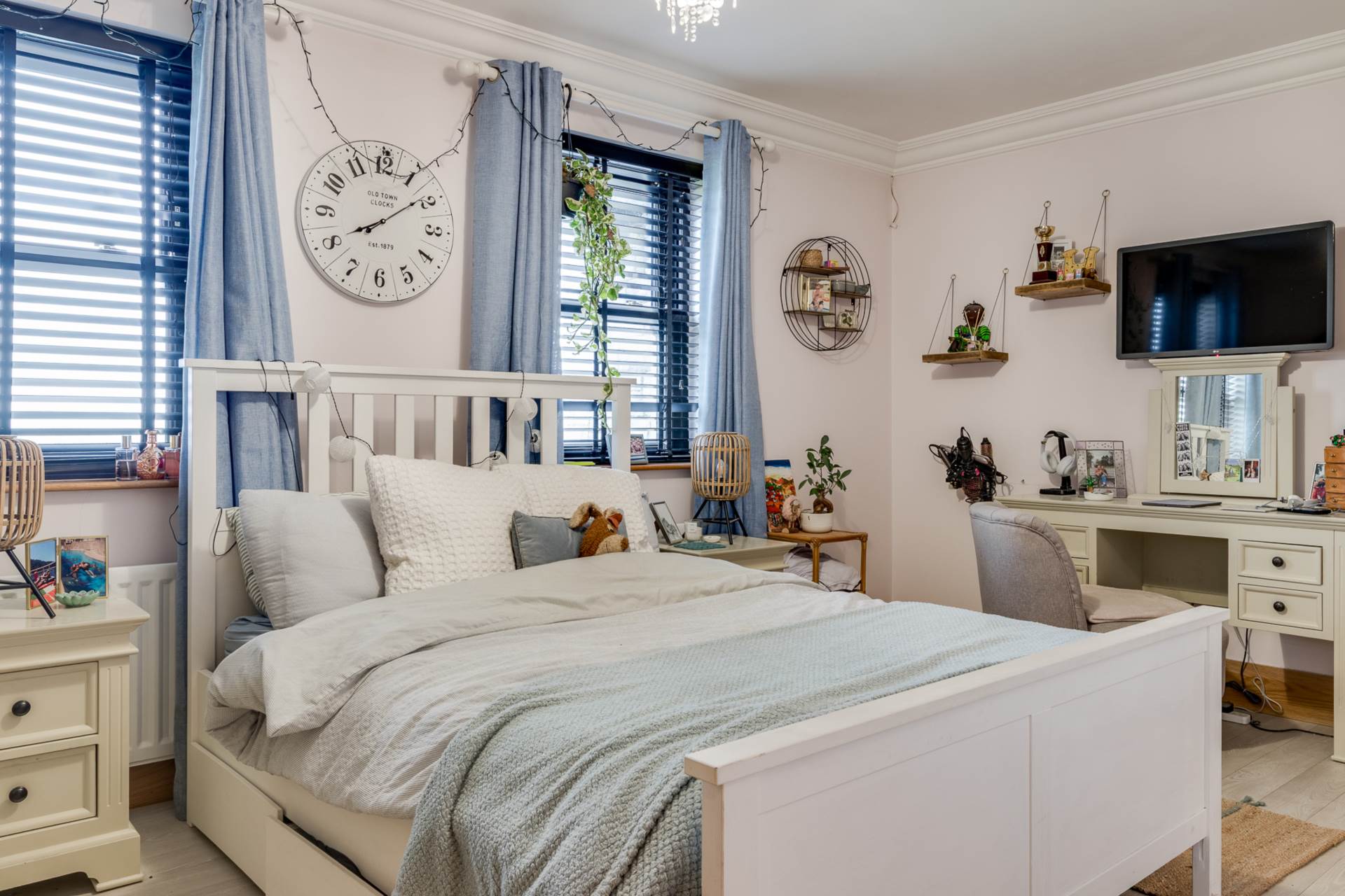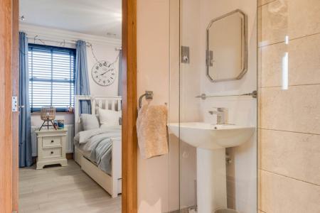 Laminate floor. Jack and Jill en suite with shower enclosure with thermostatically controlled shower fitting. Vanity sink unit and low flush WC.