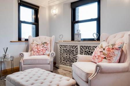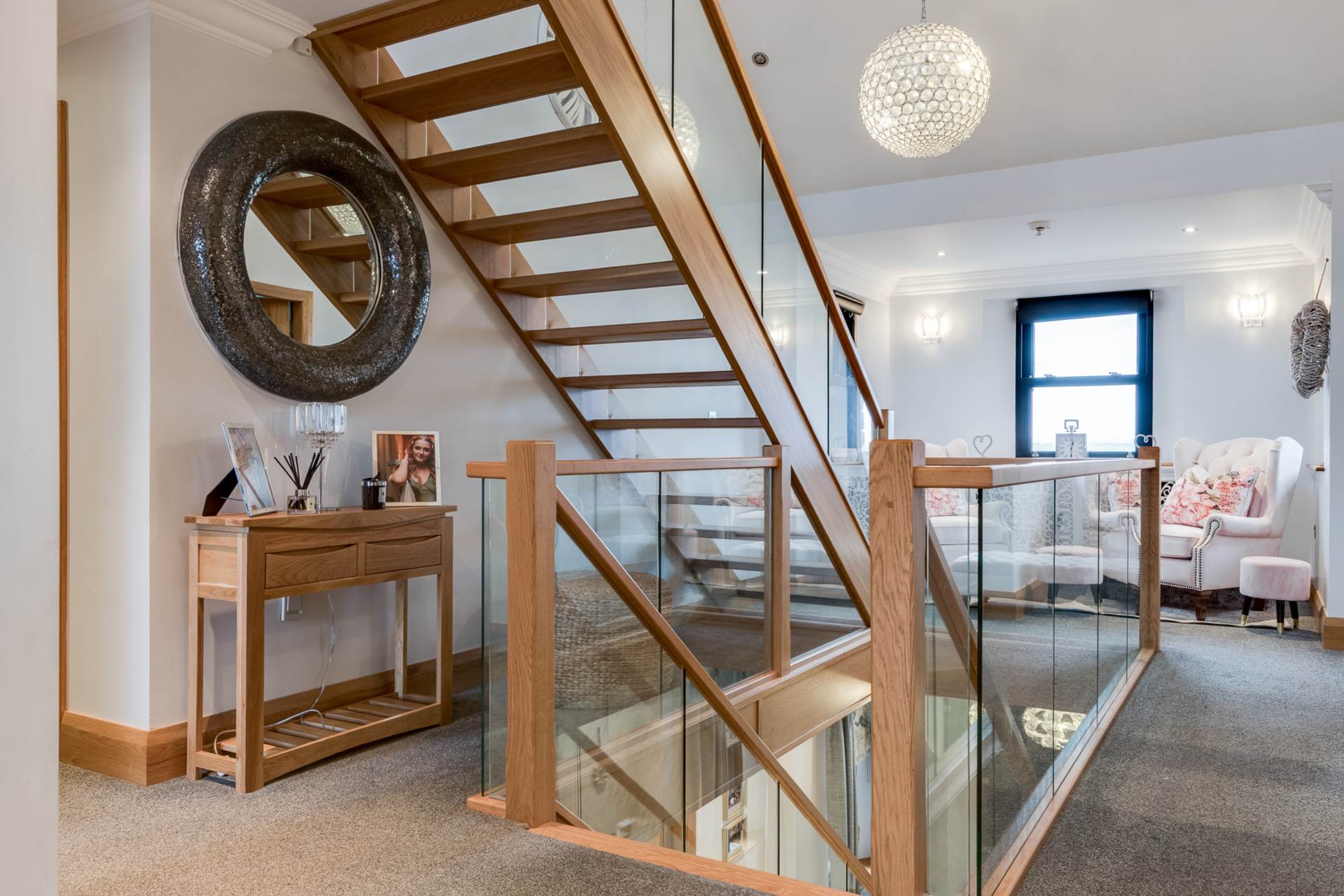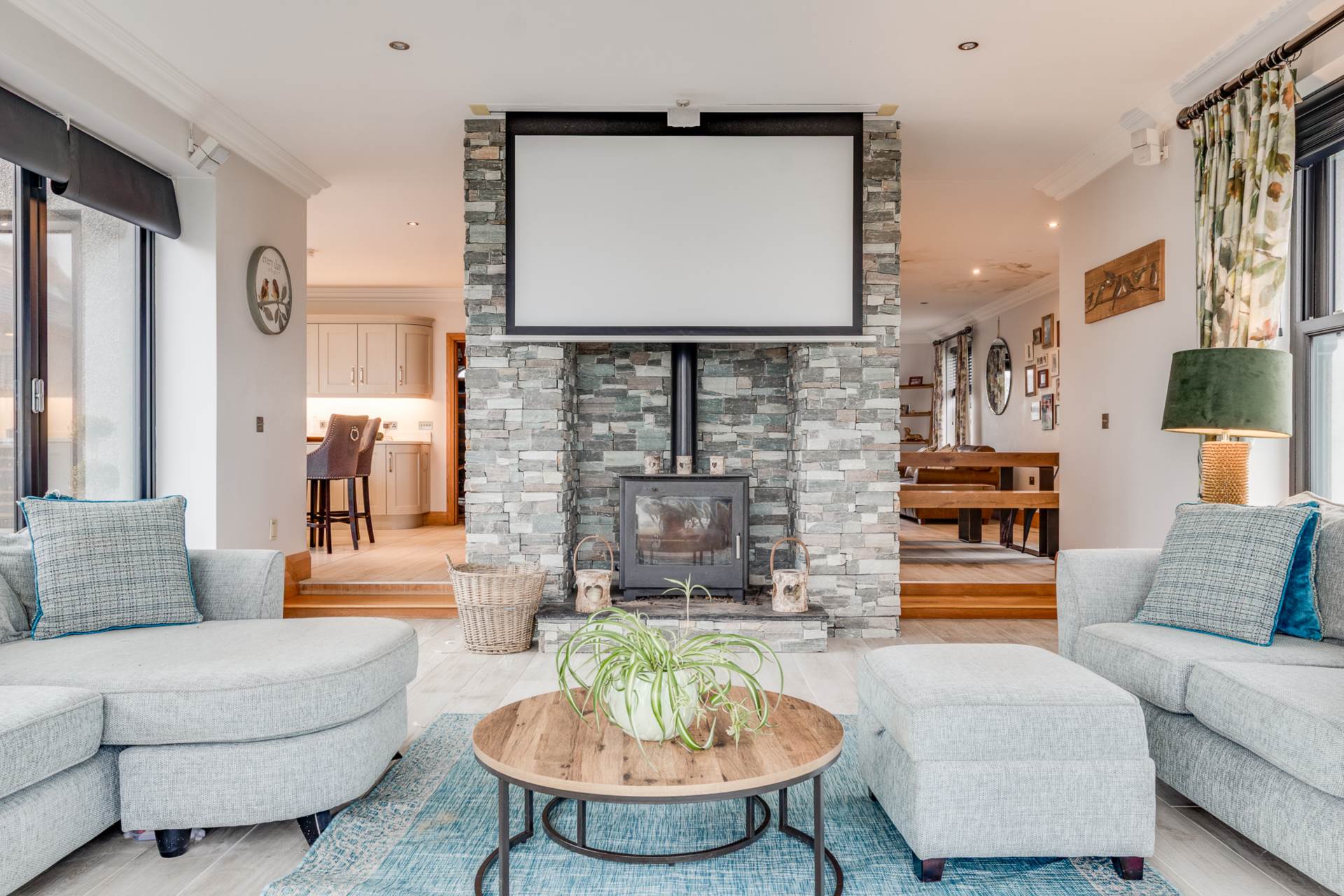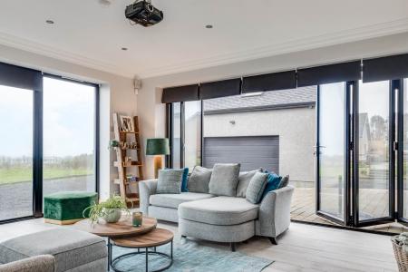 Stunning oak joinery throughout including oak and glass staircase over 3 floors - Spacious lounge open plan to sunroom, feature brick fireplace and stunning views. Separate living room with feature marble fireplace.