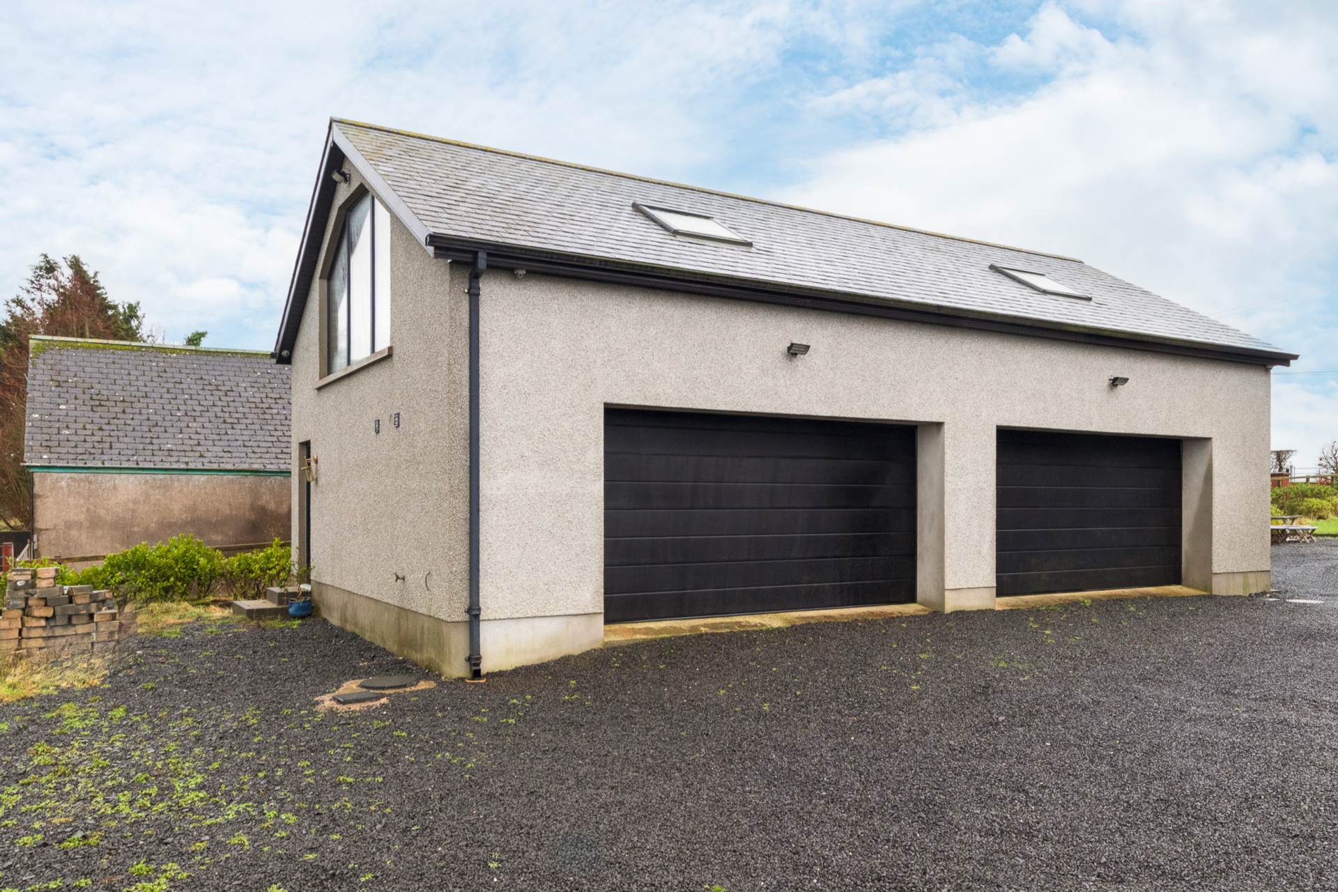 Stoned driveway and gardens to front, side and rear of property patio area with recessed lighting. Large stoned parking area bounded by laurel hedging and mature shrubs.
