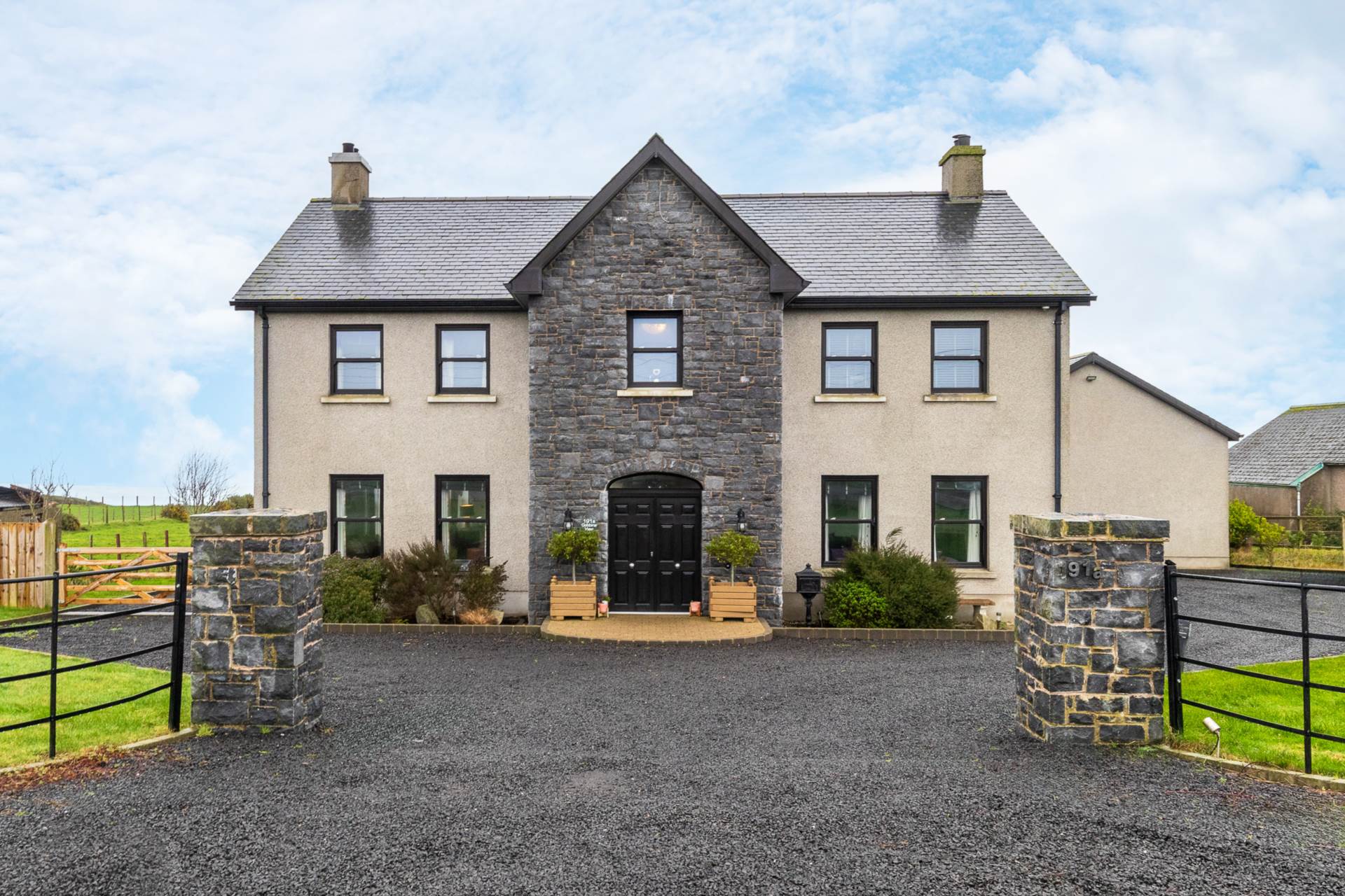 Extensive gardens in lawn and stone driveway affording ample parking