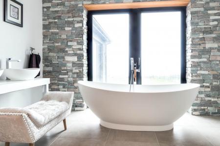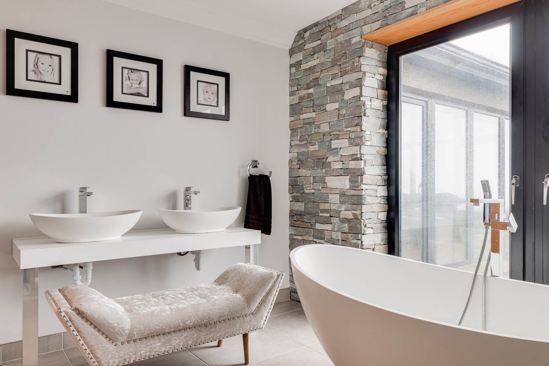 Contemporary free standing bath with free standing taps and shower head attachment. Double shower enclosure with rainfall shower head and hand held shower attachment. Modern double basin vanity stand. Bidet. Tiled floor.