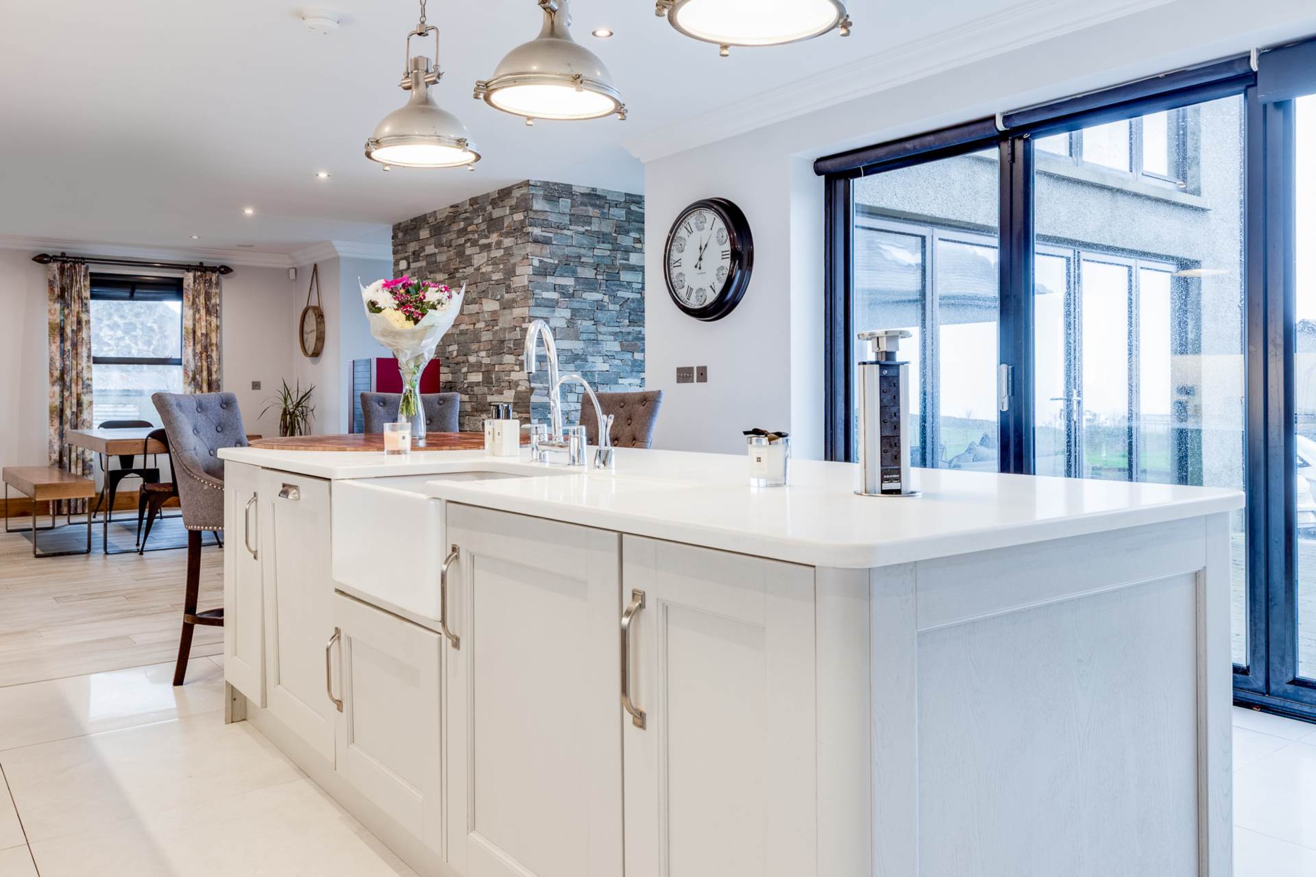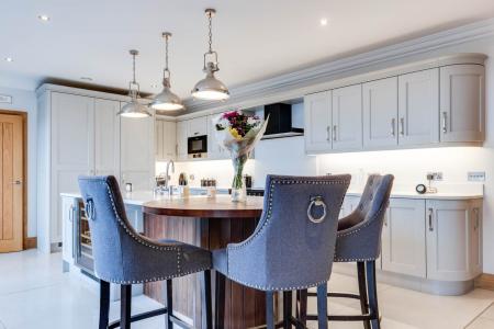 Excellent range of high and low level units including larder style unit in painted wood including many integrated appliances. Granite work tops including splash back and up stands. Feature central island with granite work top, Belfast sink and incorporating a hardwood breakfast bar area. Tiled floor. Bifold doors to patio.