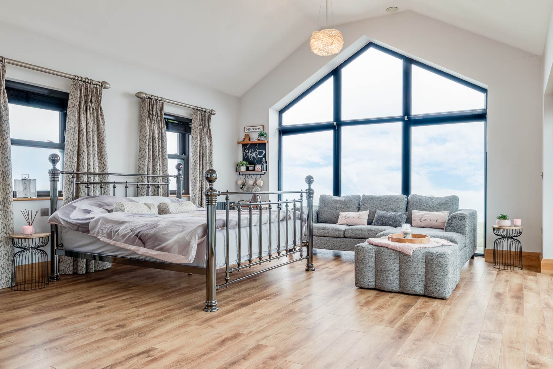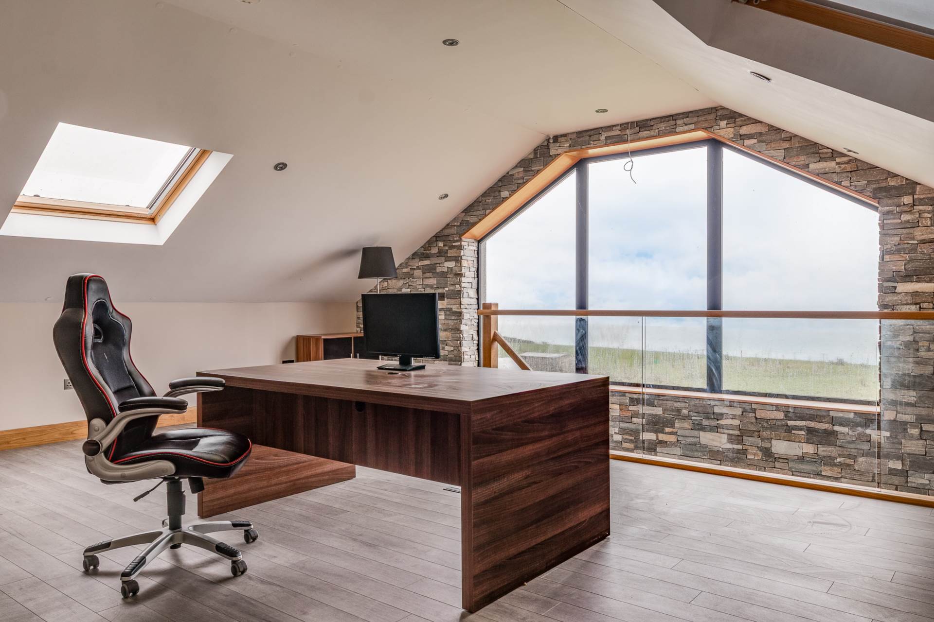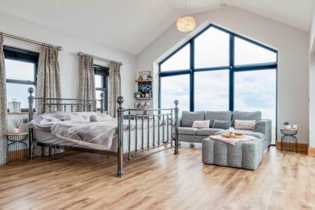 First floor to office / living area with vaulted ceiling and large picture window with stunning sea views. Laminate floor 6.37 x 6.88
