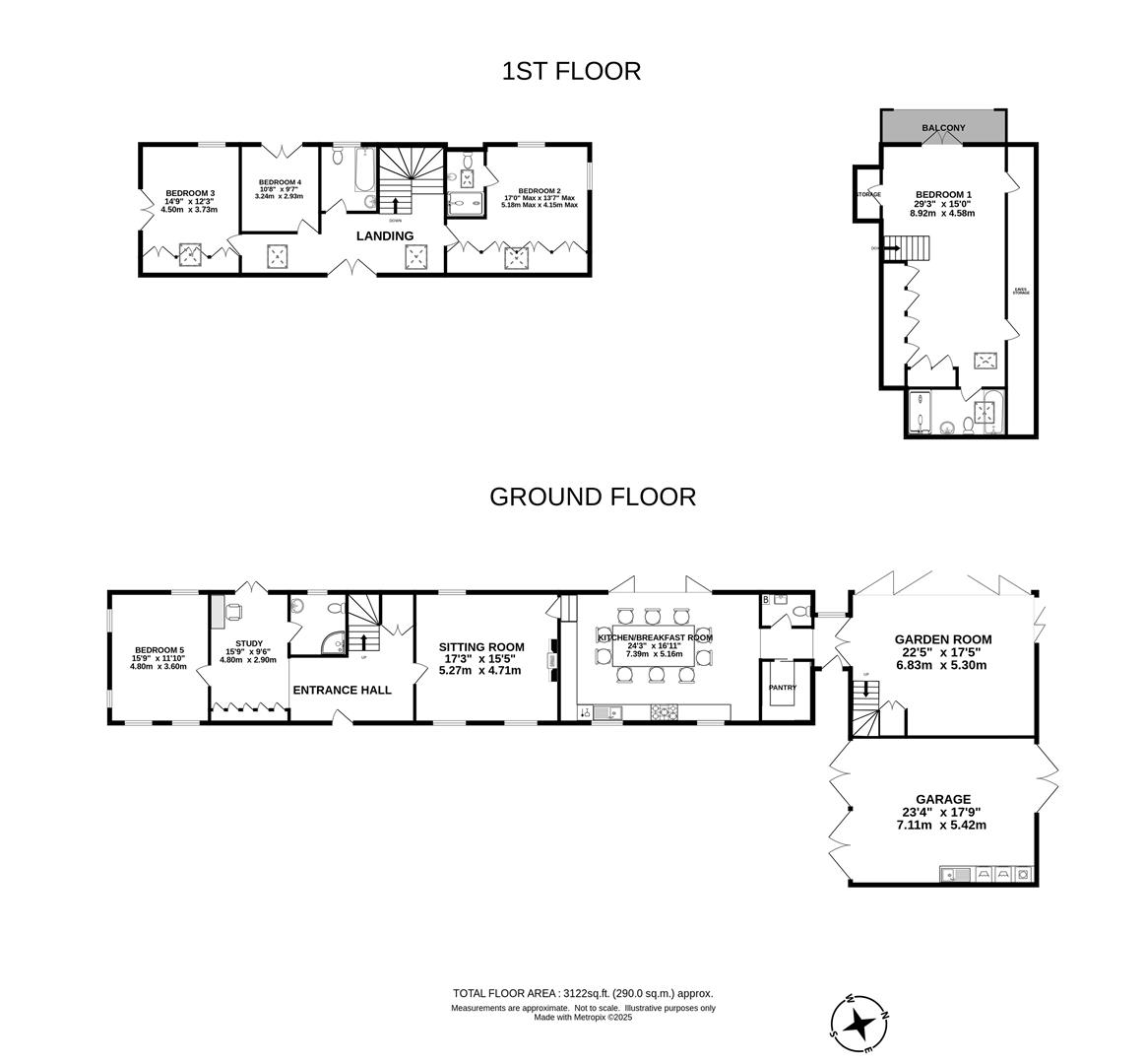 The dual aspect spacious family room has a woodburning stove on slate hearth against a feature natural stone fireplace. The Garden room, with dual aspect bi-fold doors, truly brings the outside inside whilst overlooking the gardens and surrounding farmland. Large Entrance hall / Study area with French Doors opening onto the patio. Shower room, W/C, wash handbasin and corner shower cubicle. Adjacent Bedroom 5, a triple aspect double bedroom which, with minor alteration could become a ground floor bedroom suite by incorporating the study, to create a walk through dressing room and en suite shower room. A solid oak staircase rises to the first floor to a large landing with 3 double bedrooms and a family bathroom. Bedroom 2, a dual aspect double bedroom with extensive fitted wardrobes and en suite shower room. Family bathroom, bath, W/C, wash handbasin. Bedroom 3, a dual aspect double bedroom with fitted wardrobes, Juliet balcony to the side and window overlooking the garden. Bedroom 4, double bedroom with Juliet balcony overlooking the garden.
