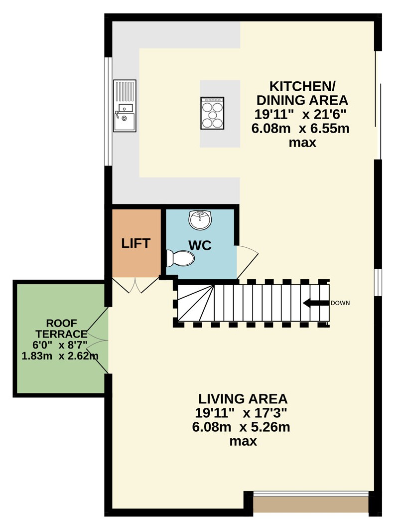 Lounge Area 19'11" (6.07m) max x 17'3" (5.26m) max.