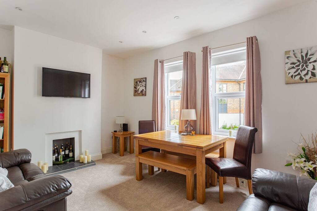 Two double glazed windows with fitted roller blinds and curtains. Feature Open fireplace. Lockable box cupboard for smart meters. Carpeted.