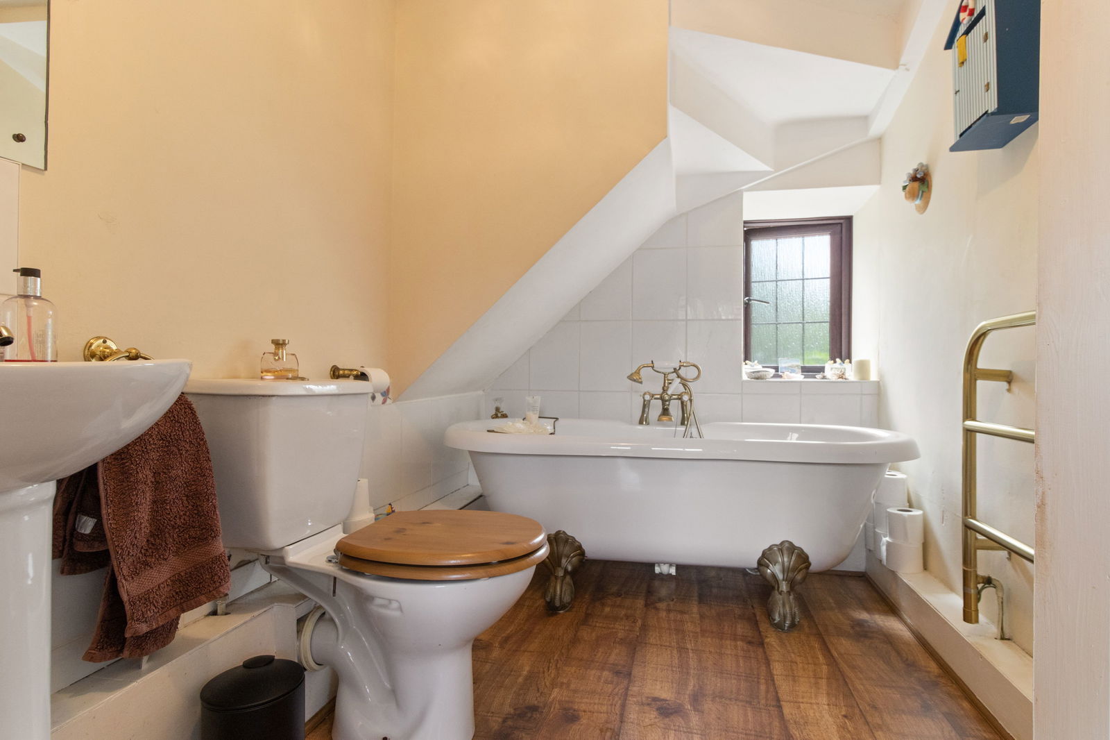 with roll top bath and a tiled surround. Wood effect laminate flooring. Obscured double glazed window to the side aspect. Ceramic sink. Low level toilet. Heated towel rail. Radiator.