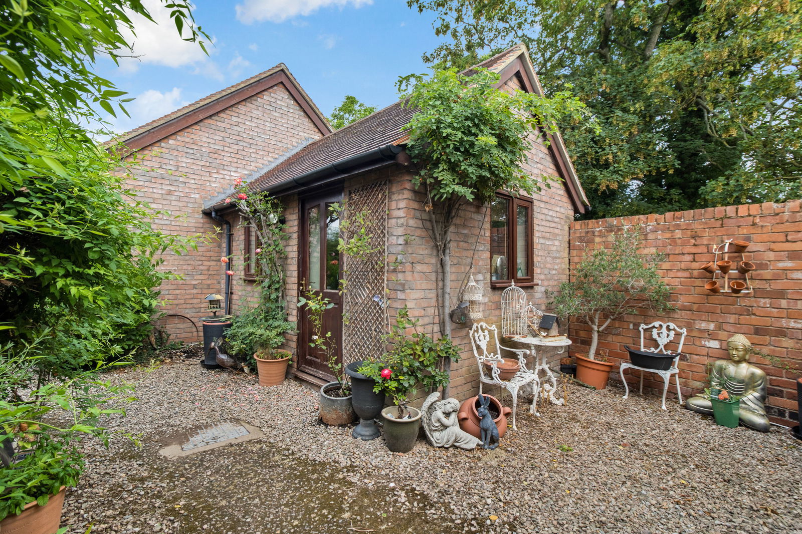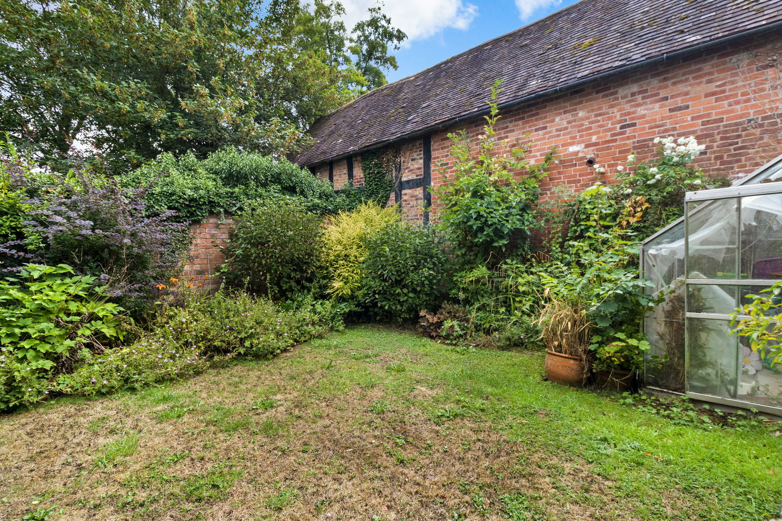 The garden stretches to the front and wraps around the property to a rear courtyard with an original outside fireplace, hot tub house and further area laid to lawn, all with deep and well stocked borders.