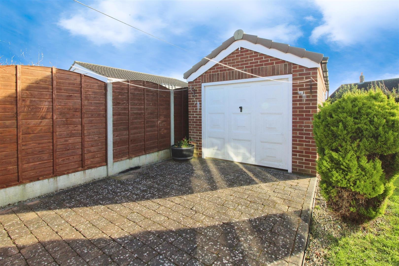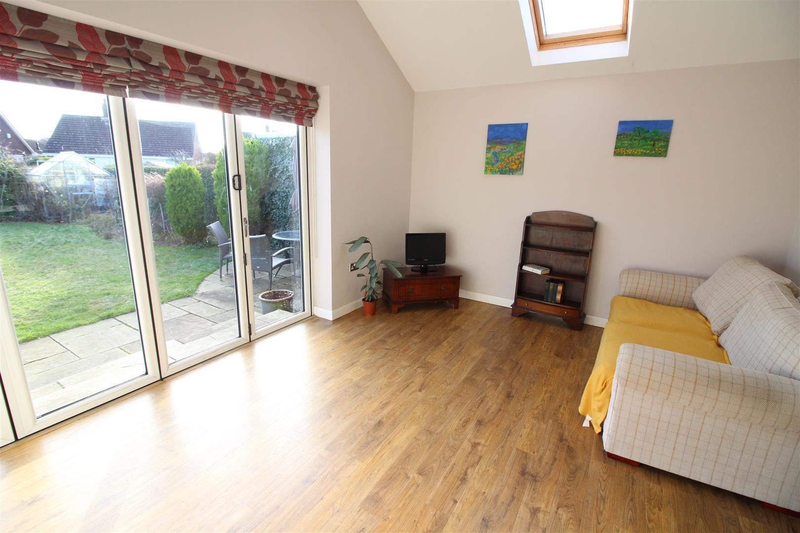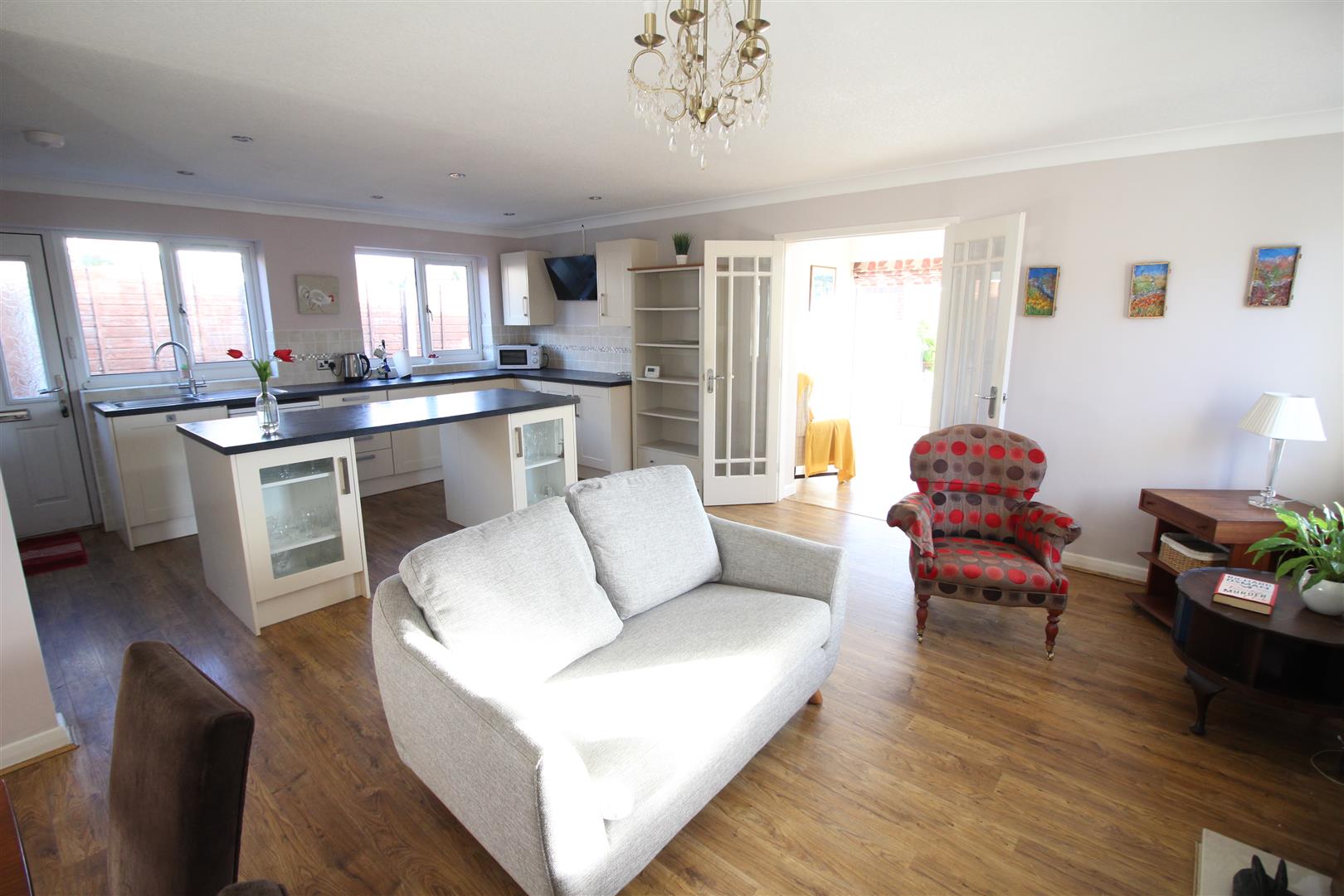 The property features an open-plan kitchen/diner with a kitchen island, dining space and built-in hob and oven and fridge/freezer, complemented by a useful utility room. The lounge overlooks the rear garden and benefits from bi-fold doors opening directly onto the garden, creating a pleasant connection between indoor and outdoor areas. Sleeping accommodation comprises a master double bedroom with built-in wardrobes, a further double bedroom with built-in wardrobes, and a single bedroom. The property includes a family bathroom and a handy shower room. Additional benefits include double-glazing and central heating. Externally, there is a manageable rear garden with lawn and block paved patio area, providing a practical space for outdoor seating and relaxation. There is a long driveway providing maple off road parking for a number of cars and leads to a detached garage. The garage has an additional store room to the rear - ideal as a potting area or extra storage.