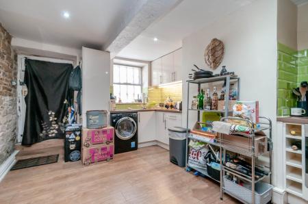 Upon entering, you`re welcomed into a well appointed kitchen fitted with a range of wall and base units, generous worktop space, an integrated oven, hob, and extractor fan, along with space for a washing machine and fridge/freezer. A convenient breakfast bar adds additional seating.