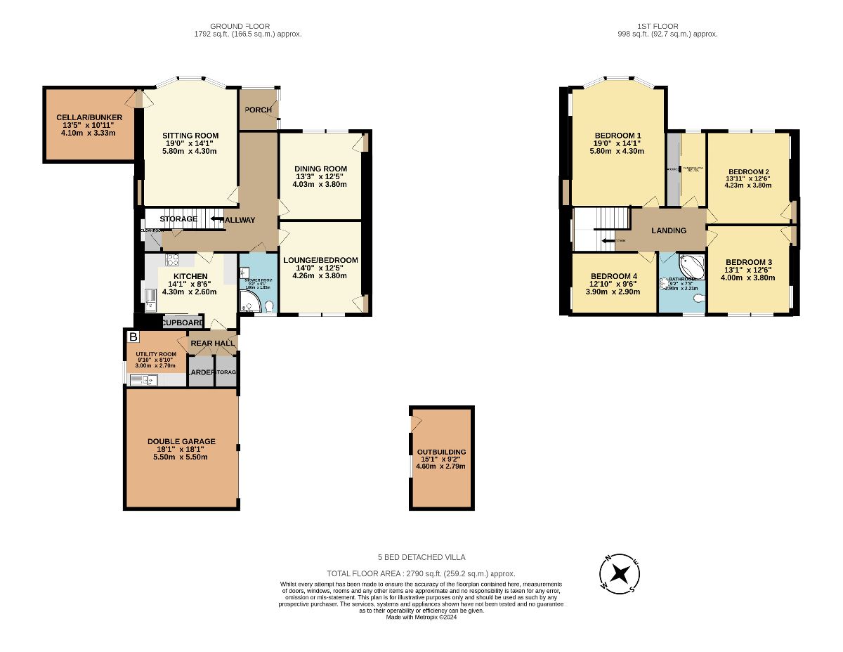 Externally, the villa is set within generous and beautifully tended gardens offering space for both entertaining and practical use. A detached outbuilding and double garage provide additional scope for conversion, making it ideal as a granny flat, home office, or creative studio.