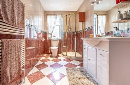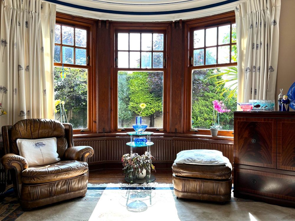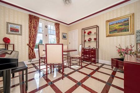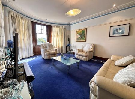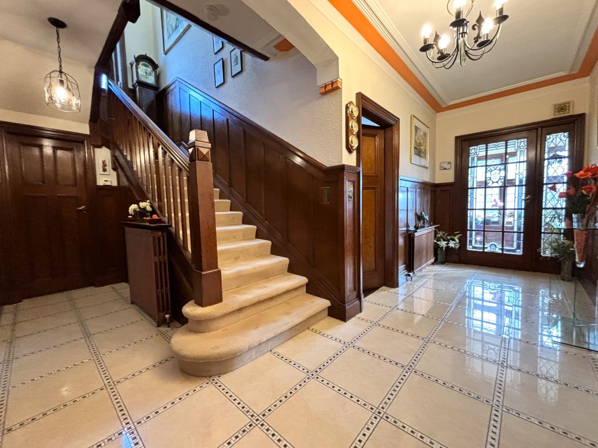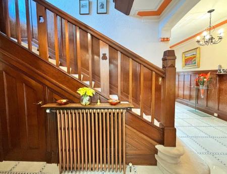 Set behind a signed gatepost entrance, the property welcomes you via a decorative porch into a grand L-shaped reception hall, featuring exquisite original Oregon pine paneling. Generous reception rooms include a bright, bay-windowed sitting room, a formal dining room with front garden views, and a tranquil rear lounge which could serve as a fifth bedroom. Also on the ground floor is a well-appointed kitchen, utility room, shower room, cloakroom, and extensive built-in storage.
