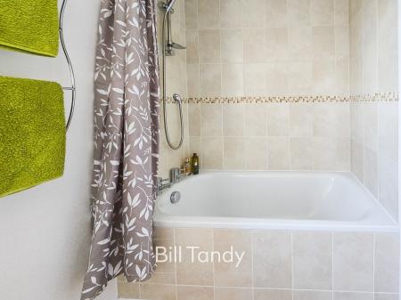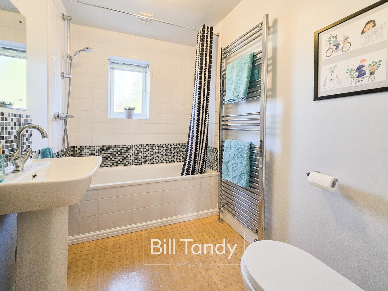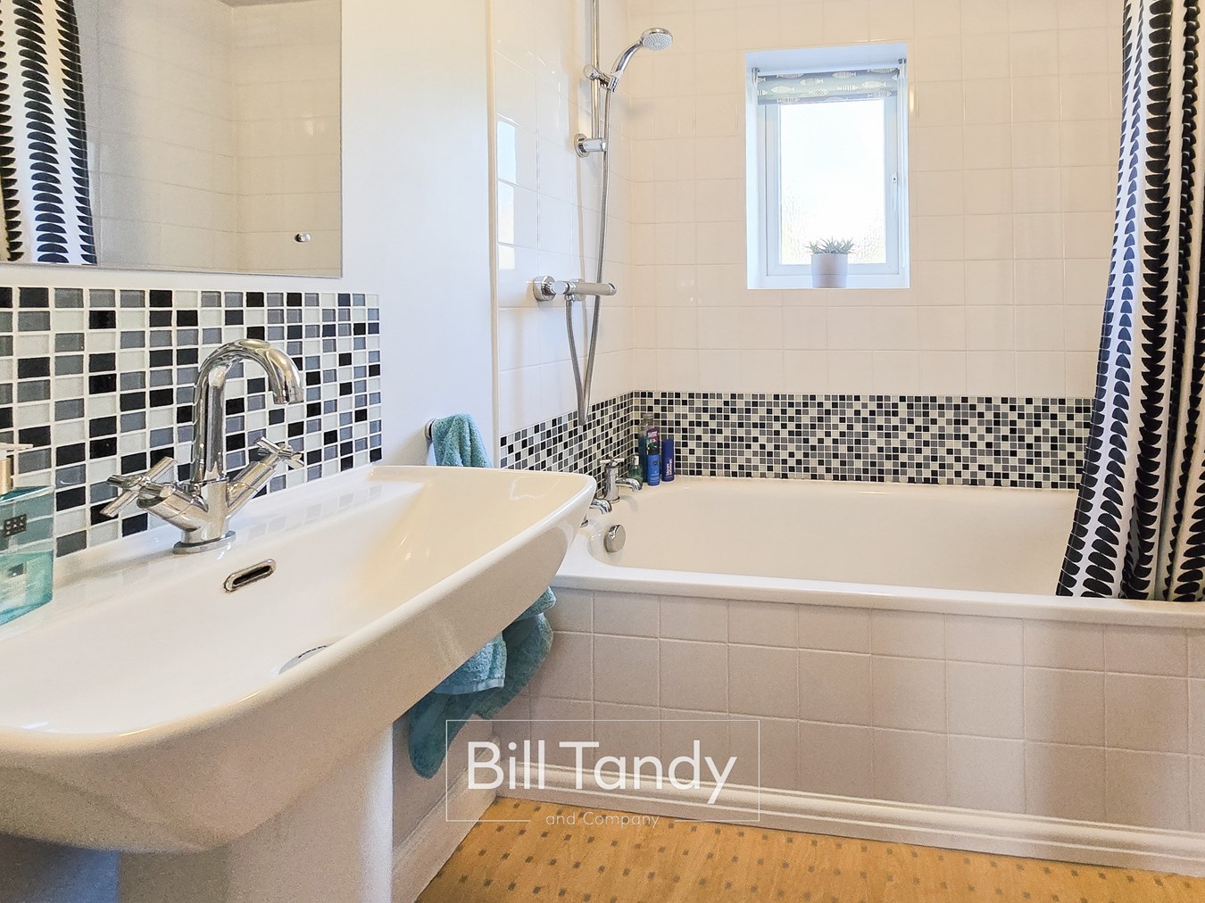2.35m x 1.71m (7' 9" x 5' 7") having an obscure double glazed window to rear, chrome heated towel rail and modern white suite comprising pedestal wash hand basin with mosaic tiled surround, low flush W.C. and bath with shower over.