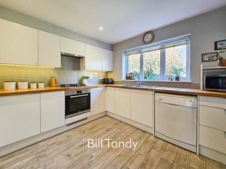 3.26m x 3.19m (10' 8" x 10' 6") superbly modernised and updated and having a double glazed window to rear, upright designer radiator, contemporary kitchen units comprising base cupboards and drawers with wooden preparation tops above, tiled splashback surround and wall mounted cupboards, inset stainless steel one and a half bowl sink unit, inset Bosch oven with a four ring gas hob and extractor fan above, spaces ideal for fridge/freezer and dishwasher, spotlighting and tiled floor.
