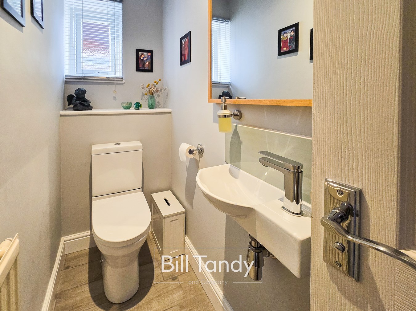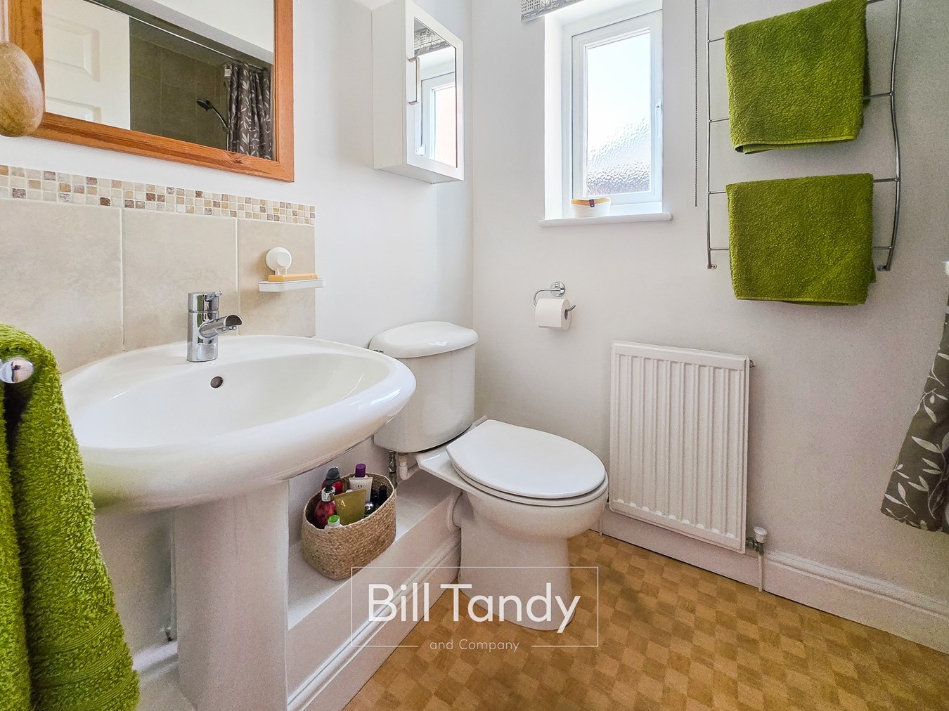 having an obscure double glazed window to side, tiled floor, radiator and suite comprising wall mounted wash hand basin and low flush W.C.