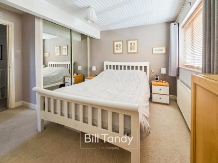 4.33m x 3.73m (14' 2" x 12' 3") having two double glazed windows to front, radiator, recess ideal for dressing table or wardrobe, fitted wardrobes with sliding mirrored doors and door to: