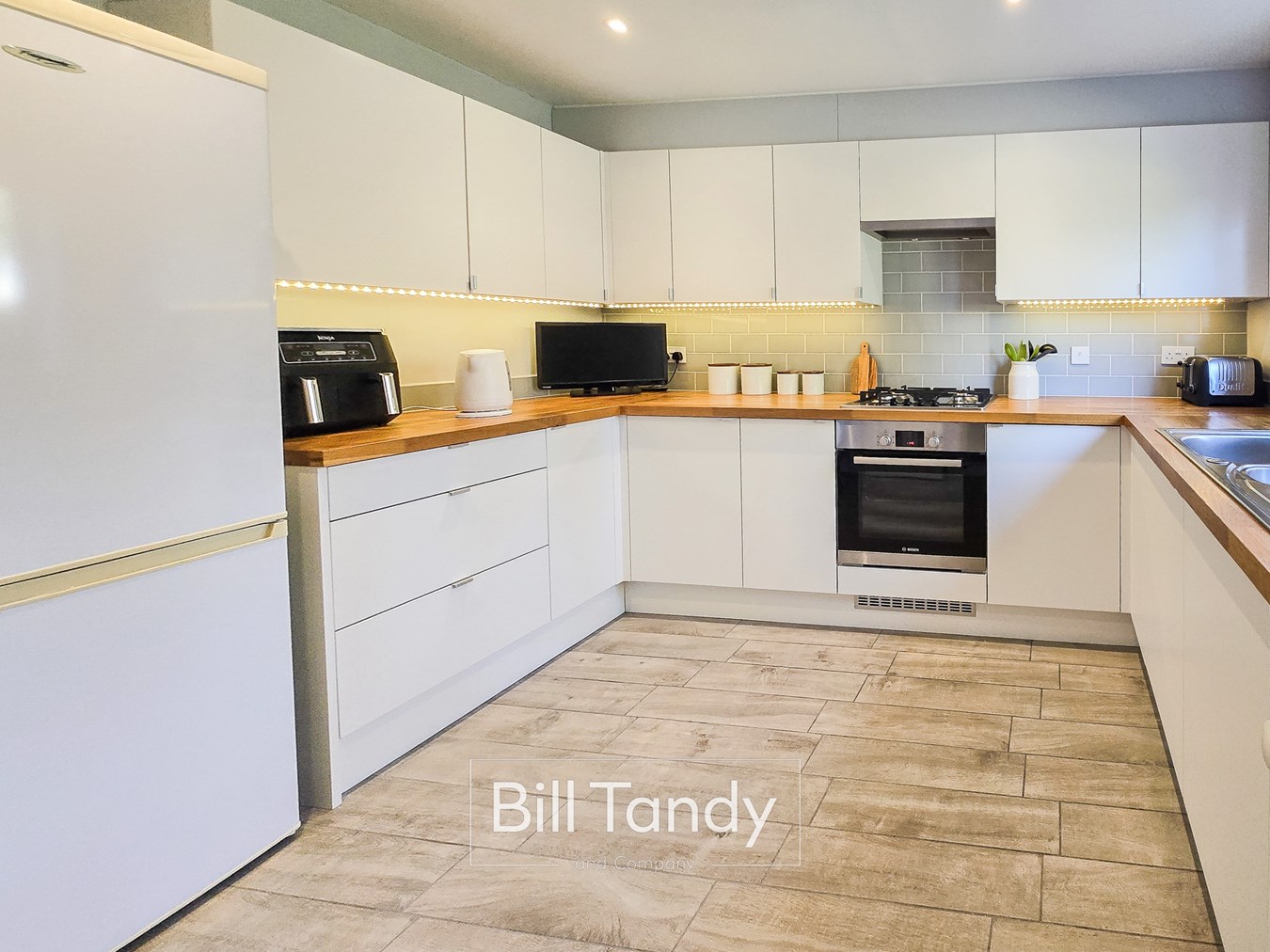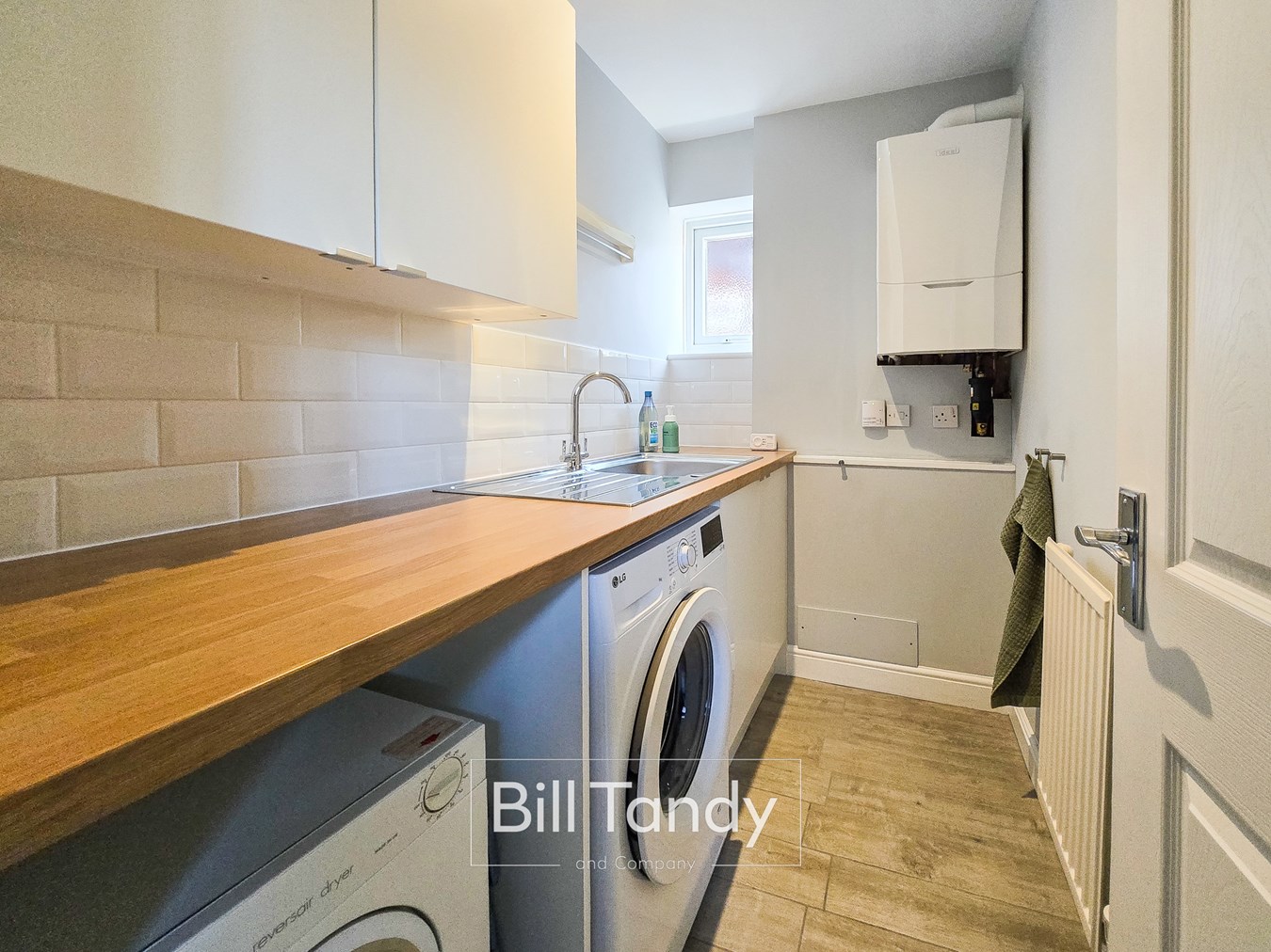 2.17m x 1.41m (7' 1" x 4' 8") having obscure double glazed window to side, radiator, tiled floor, Ideal boiler, base and wall mounted storage cupboards, round edge work top and tiled splashback surround, inset stainless steel sink and spaces ideal for washing machine and tumble dryer.
