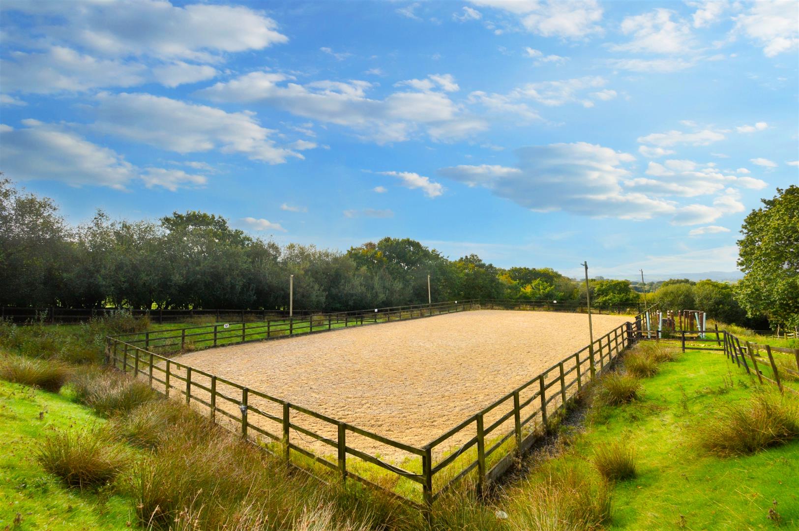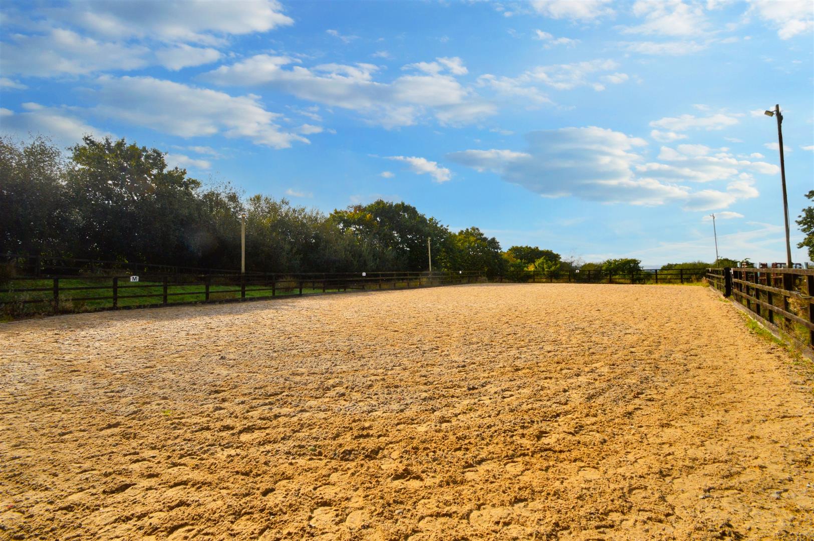 Sand School (B) - 20.00m x 40.00m (65'7" x 131'2" ) - Professionally installed base, drainage, sand and fibre surface enclosed within post and rail fencing.