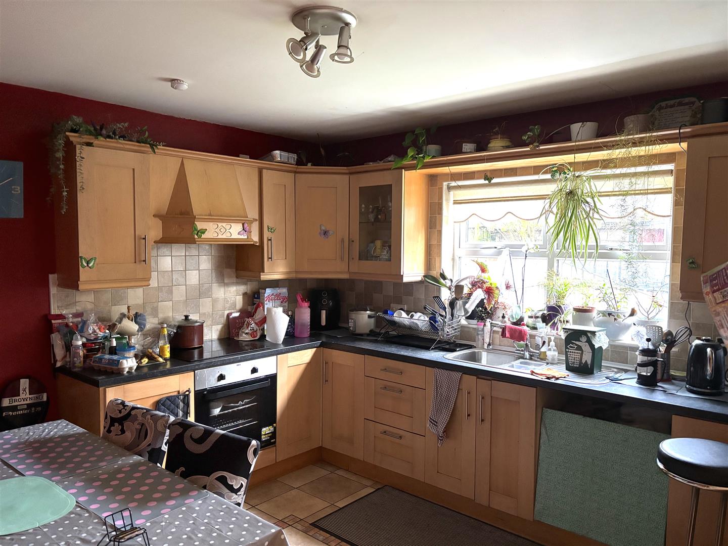 Kitchen: - 3.7 x 3.7 (12'1" x 12'1") - Fitted with a range of eye and low level units. Stainless steel sink unit. Built in fridge freezer. Built in hob and oven. Pelmet over window. Tiled around units. Tiled flooring.