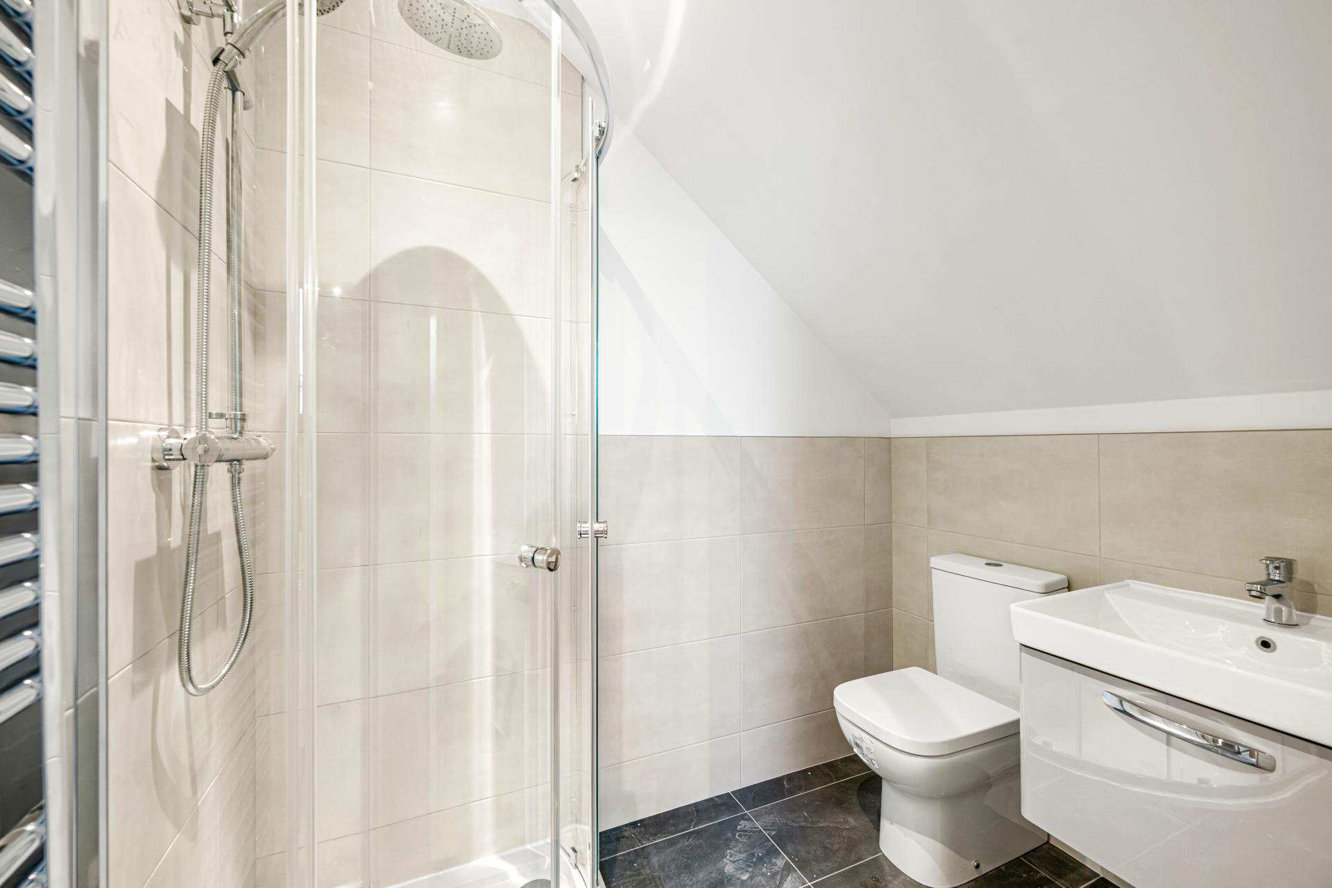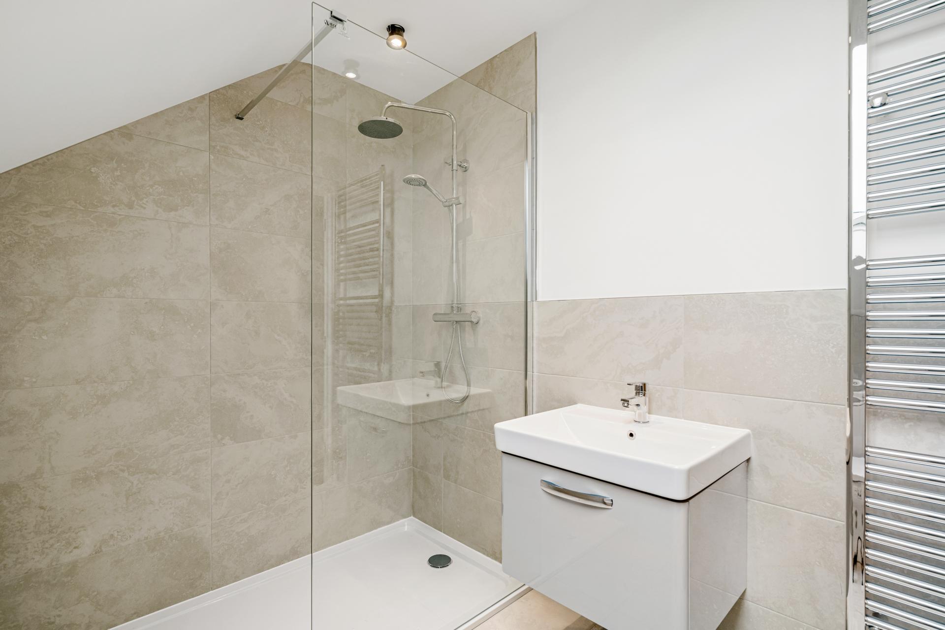 EN-SUITE 8' 7" x 6' 9" (2.62m x 2.06m) With tiled flooring, part tiled walls, low level WC, wash hand basin with drawer below, walk-in shower with glass surround and rainfall head, heated towel rail, extractor fan, spotlighting and Velux rooflight.