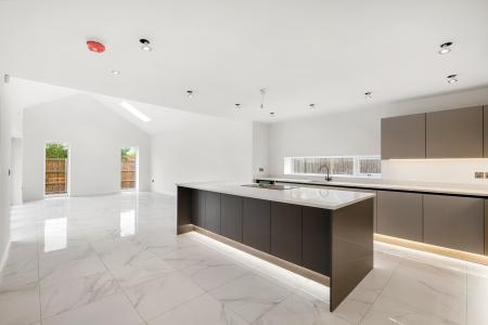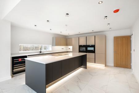 At the heart of the home lies a stunning open plan kitchen, living, and dining space with vaulted ceilings, bi-fold doors opening onto the rear garden, and porcelain tiled flooring with underfloor heating. The kitchen is beautifully appointed with Quartz work surfaces, a large central island with breakfast bar, and a full range of integrated appliances, including AEG oven, microwave, warming drawer, and induction hob with downdraught extractor, together with a full-height fridge, freezer, and wine cooler.