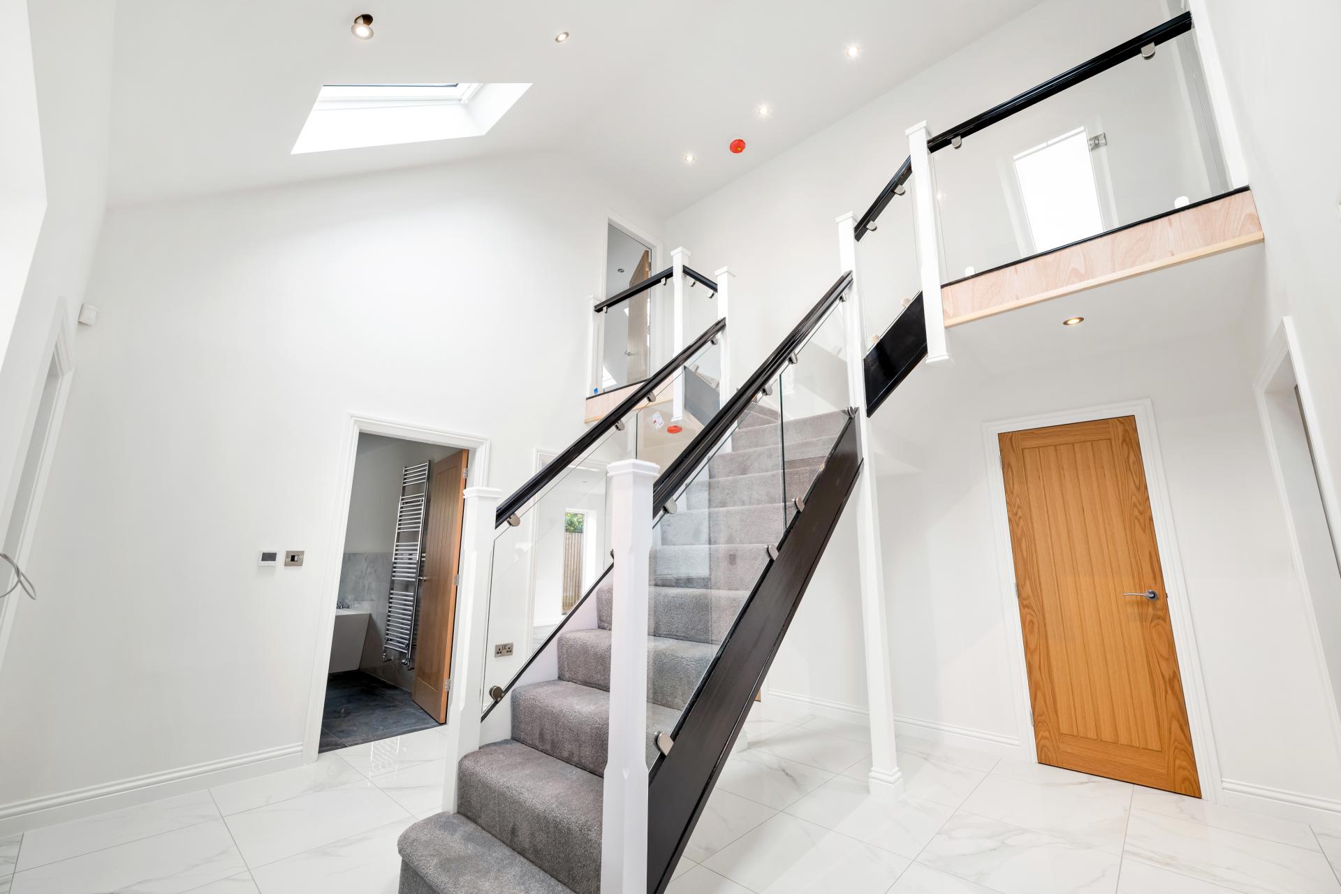 ENTRANCE HALL 14' 8" x 13' 10" (4.47m x 4.22m) With composite external door, UPVC double glazed window, porcelain tiled flooring, striking T-shaped staircase with glass balustrade, two Velux rooflights, underfloor heating and spotlighting.