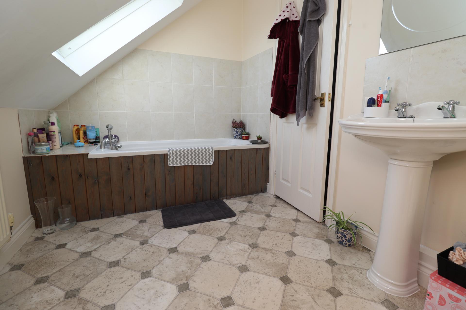 EN SUITE BATHROOM Fitted with a three piece suite comprising of panelled bath, pedestal wash hand basin and close coupled WC, cupboard housing the gas fired central heating boiler, tiled splashbacks, radiator and Velux window to the rear aspect.