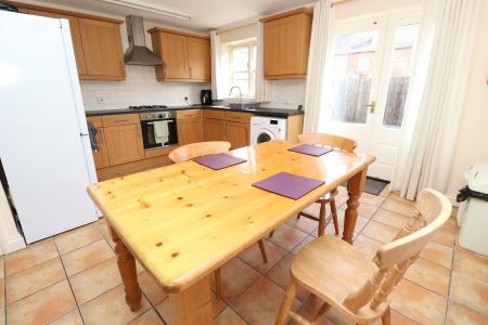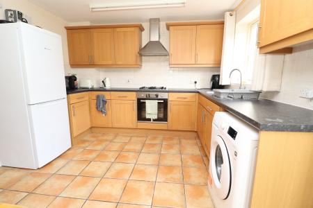 KITCHEN/DINER 15' 2 (max)" x 14' 2 (max)" (4.62m x 4.32m) Fitted with a range of wall and base units with work surfaces over, stainless steel 1 1/2 bowl sink with side drainer and mixer tap over, electric oven and gas hob with extractor fan, spaces for washing machine and fridge freezer, tiled flooring, tiled splashbacks, radiator, double glazed window and French doors to the rear garden.