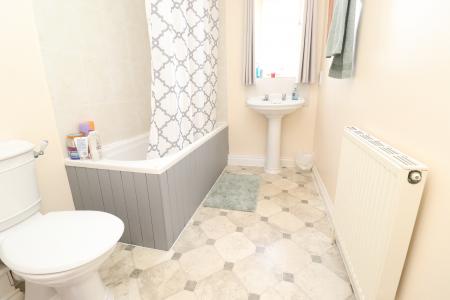 BATHROOM Fitted with a three piece suite comprising of panelled bath with shower over, pedestal wash hand basin and close coupled WC, airing cupboard, tiled splashbacks, radiator and double glazed window to the rear aspect.