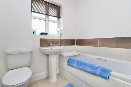 BATHROOM 6' 11" x 5' 0" (2.11m x 1.52m) With UPVC double glazed window, low-level WC, wash hand basin, bath with tiled surround, radiator, spotlighting and extractor fan.