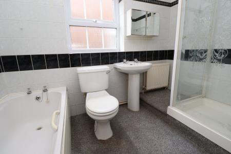 BATHROOM Fitted with a four piece suite comprising of panelled bath, shower cubicle, pedestal wash hand basin and close coupled WC, tiled walls, double glazed window to the side aspect and radiator.