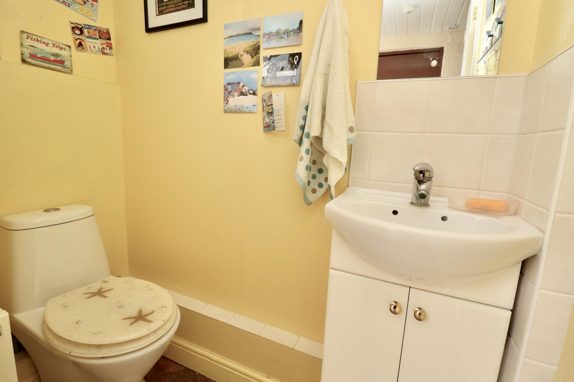 CLOAKROOM/WC With close coupled WC, wash hand basin in a vanity unit, tiled splashbacks and radiator.