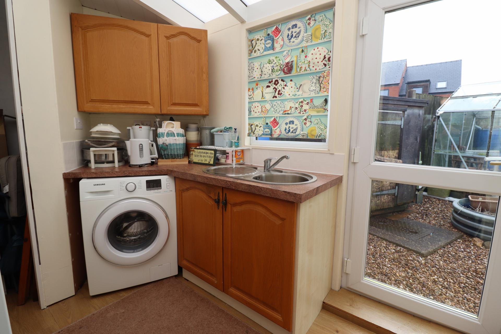 SIDE LOBBY/UTILITY Fitted with a range of wall and base units with work surfaces over, stainless steel sink with side drainer and mixer tap over, spaces for washing machine and tumble dryer, tiled splashbacks, laminate flooring, double glazed windows to the side and rear aspects and doors to the garden and garage.