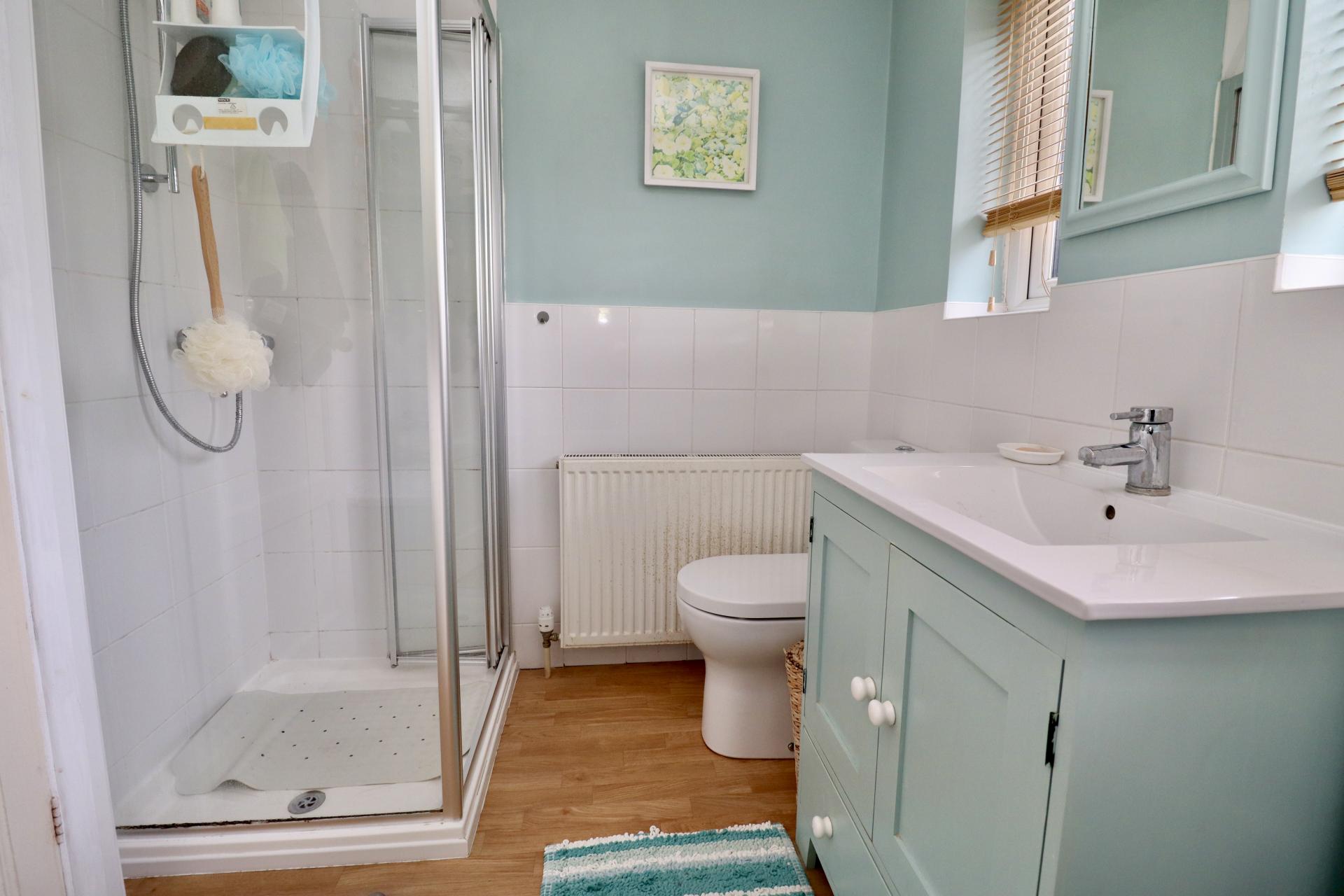 BATHROOM Fitted with a four piece suite comprising of shower cubicle, panelled bath, close coupled WC and wash hand basin in a vanity style unit, tiled splashbacks, radiator and double glazed window to the side aspect.