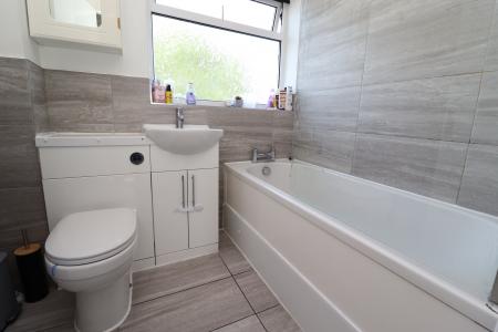 BATHROOM Fitted with a three piece suite comprising of panelled bath, shower over and glass shower screen, wash hand basin in a vanity style unit and close coupled WC, tiled flooring, part tiled walls, chrome towel radiator and double glazed window to the rear aspect.