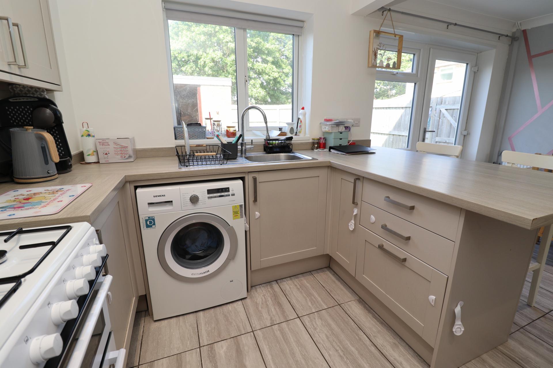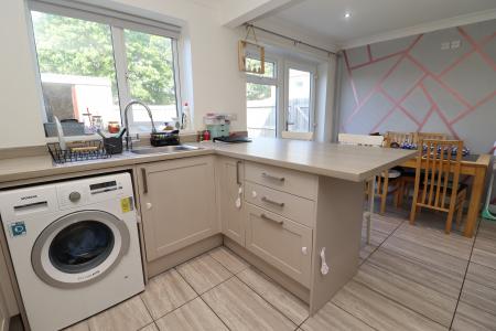 KITCHEN/DINER 15' 10" x 10' 3" (4.85m x 3.13m) Fitted with a modern range of wall and base units with work surfaces, stainless steel sink, side drainer and mixer tap, spaces for cooker, fridge freezer and washing machine, tiled flooring, spotlights, radiator, double glazed window to the rear aspect and door to the garden.