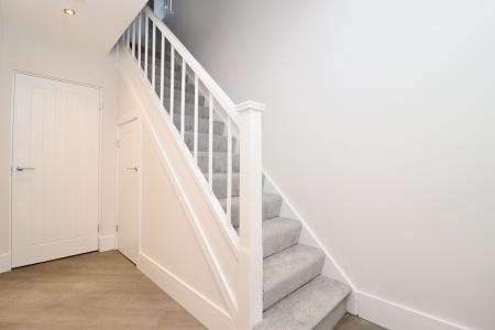 HALL With composite external door, vinyl flooring, stairs to the first floor, storage cupboard and spotlighting.