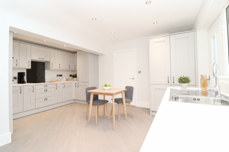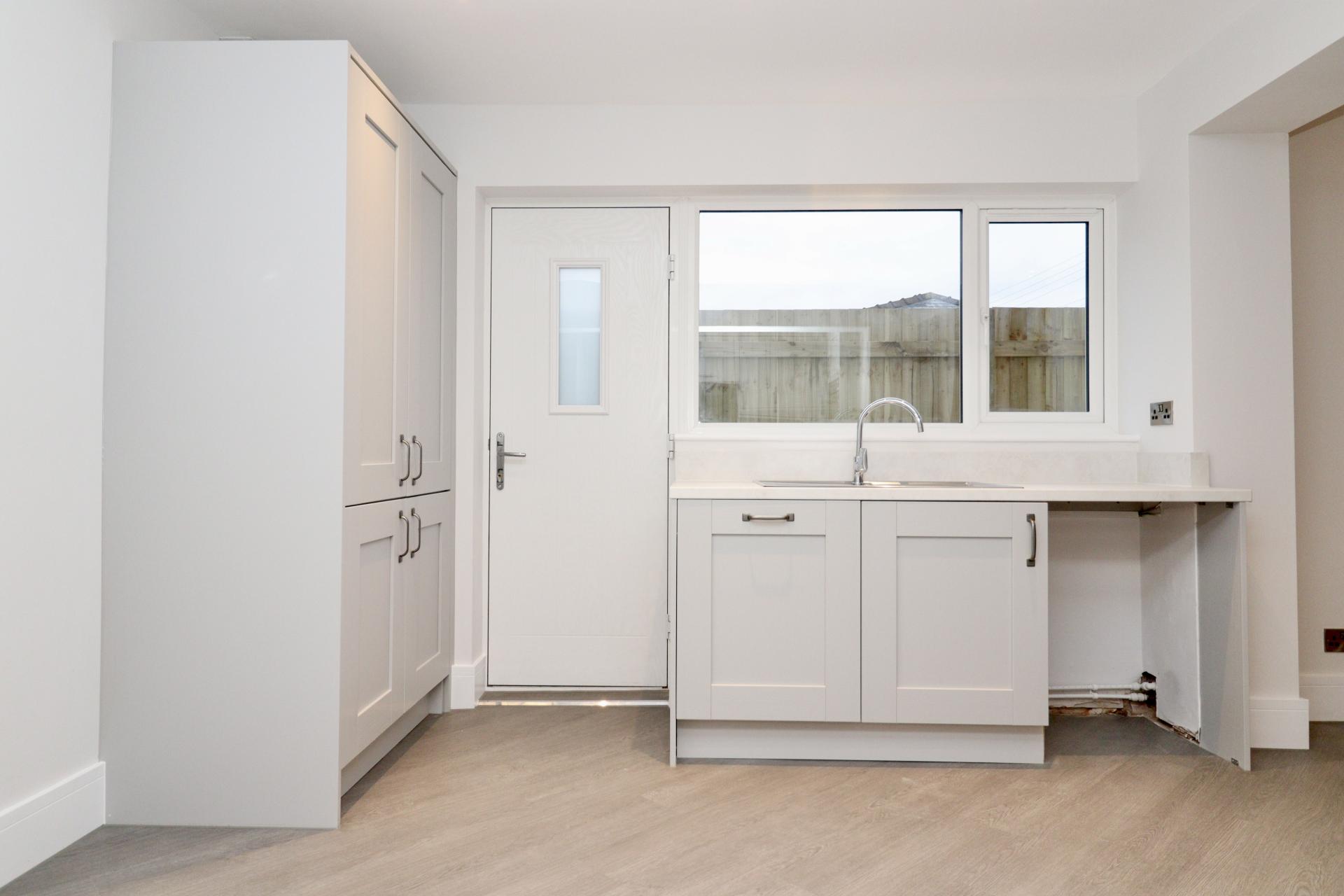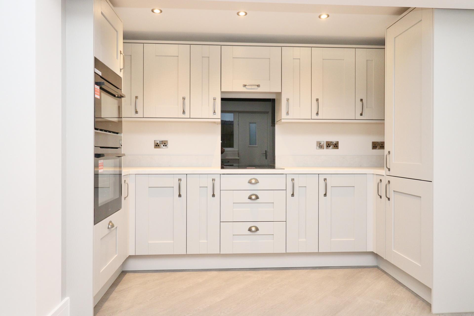 KITCHEN 15' 6" x 10' 11" (4.72m x 3.33m) With UPVC double glazed window and composite external door, vinyl flooring, fitted with a range of wall, base units and drawers with work surfaces over, matching upstand, stainless steel sink unit and drainer, integrated double oven, four ring induction hob with matching glass splashback and extractor fan over, integral dishwasher, plumbing and space for washing machine, integrated fridge freezer, spotlighting and vertical radiator.