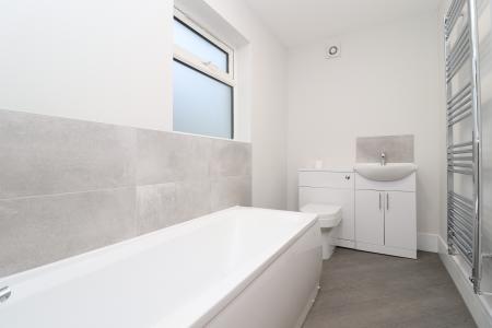 BATHROOM 9' 7" x 5' 2" (2.92m x 1.57m) With UPVC double glazed window, vinyl flooring, suite to comprise of low level WC, wash hand basin with cupboard space below and a bath with tiled surround, heated towel rail and opening into the a shower area.