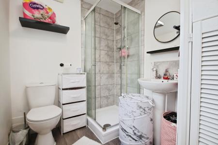 BATHROOM Fitted with a three piece suite comprising of shower cubicle, WC and wash hand basin, tiled walls, chrome radiator, UPVC window, extractor and airing cupboard housing the wall mounted boiler.