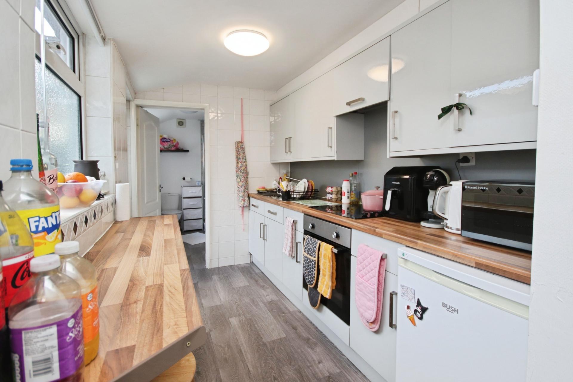 KITCHEN 10' 3" x 6' 0" (3.12m x 1.83m) Fitted with a range of wall and base units, electric oven, hob with extractor over, breakfast bar, stainless steel sink with mixer tap, UPVC window and door to the rear yard and door to rear yard.